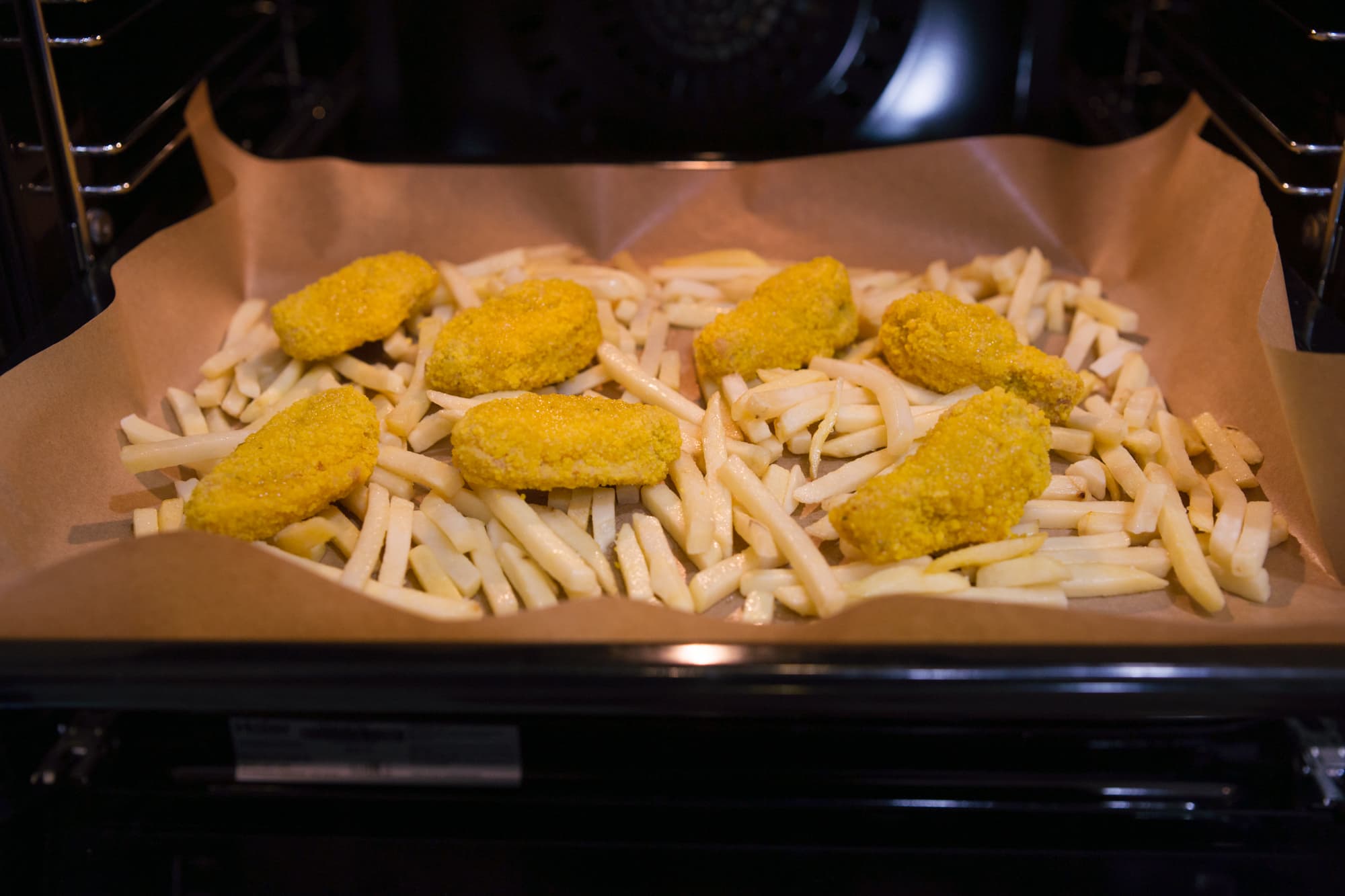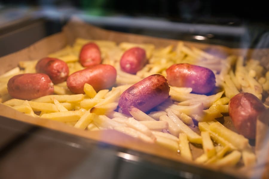Для проверки режима Аэрогриль мы взяли замороженный картофель-фри, разложили его на противень, добавили колбаски и отправили в камеру, разогретую до 200 °C. Ровно через 25 минут все было готово.