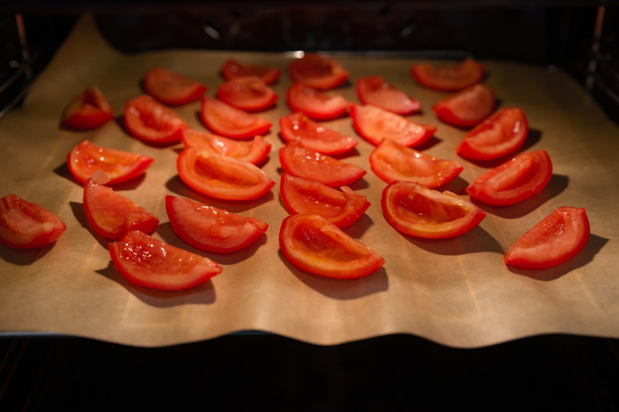 Для тестирования режима сушки в разогретую до 70 °C духовку была помещена решетка с дольками томатов, лишенных плодоножек и прочих внутренностей. Как и в тесте с приготовлением в вакууме, духовка снова оповестила о выходе на заданную температуру преждевременно.