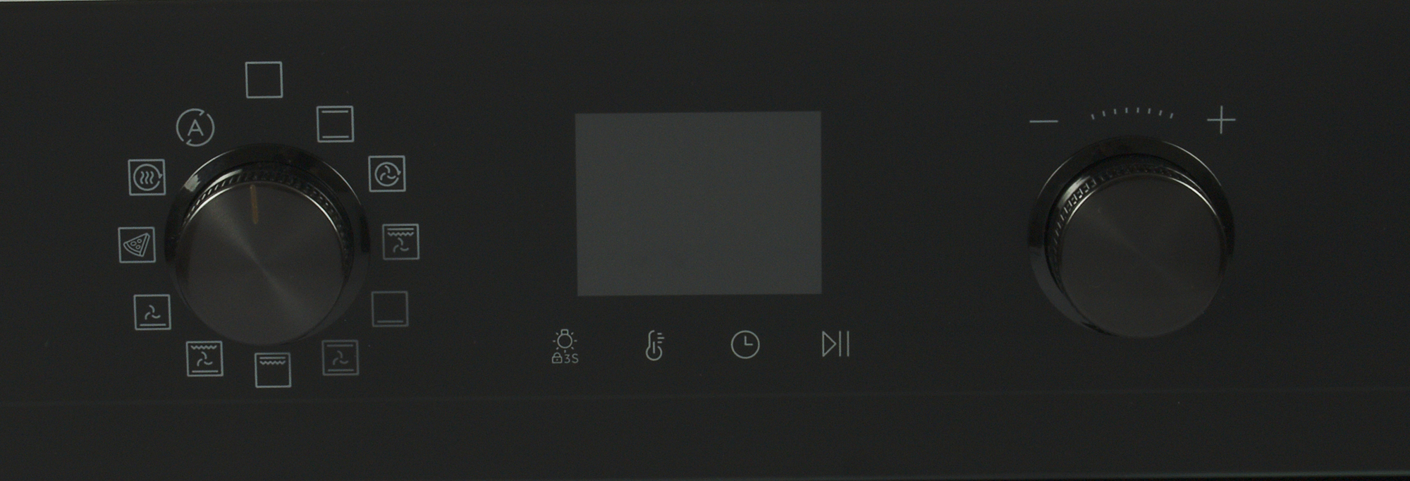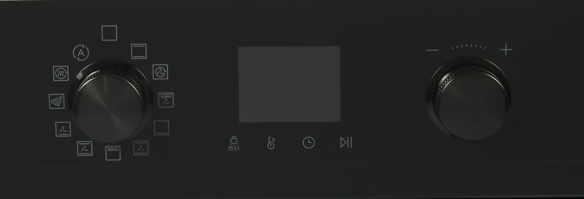 Верхнюю часть лицевой панели традиционно занимает блок управления с дисплеем, сенсорными кнопками под ним и двумя утапливаемыми ручками-регуляторами по бокам. Ручки пластиковые с рифленым покрытием в области захвата пальцами.