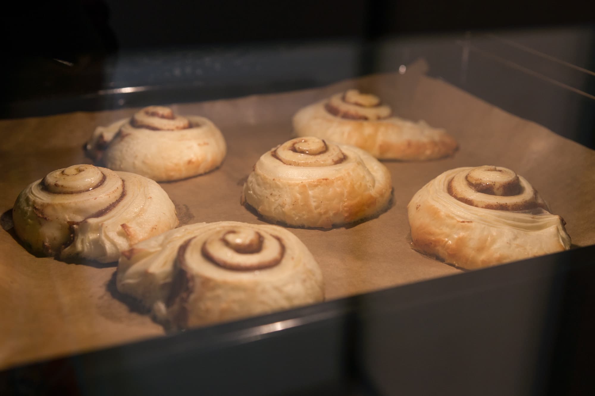Уложили рулеты на противень, застеленный пекарской бумагой и отправили в разогретую до 200 °C духовку на режим верхнего и нижнего нагрева с конвекцией.