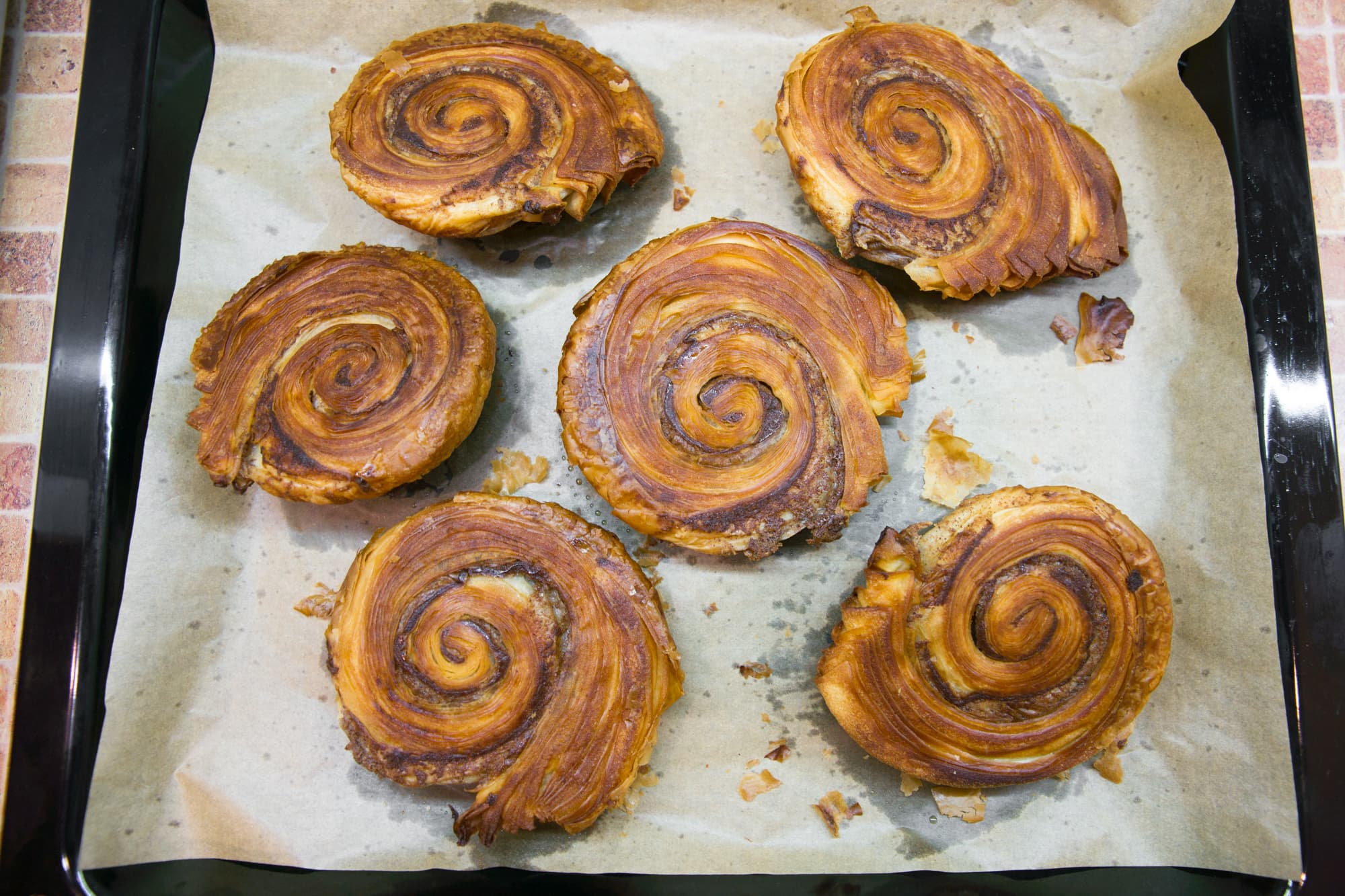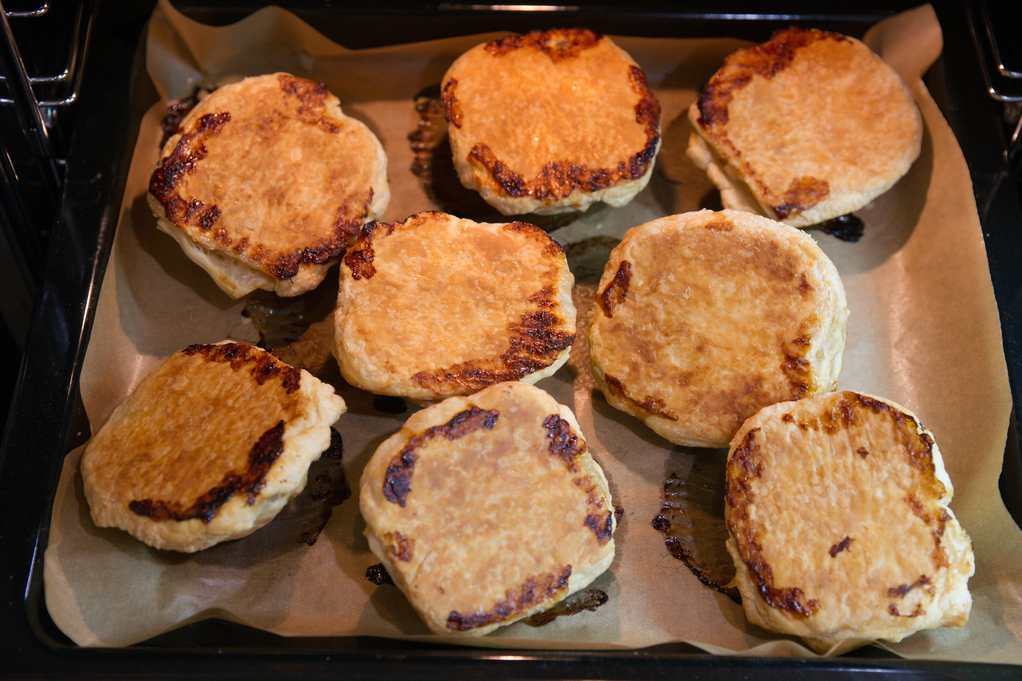 Через 20 минут выключили нагрев и оставили слойки внутри еще минут на 10. Тесто превосходно раскрылось, что сверху, что снизу — все отлично подрумянилось.