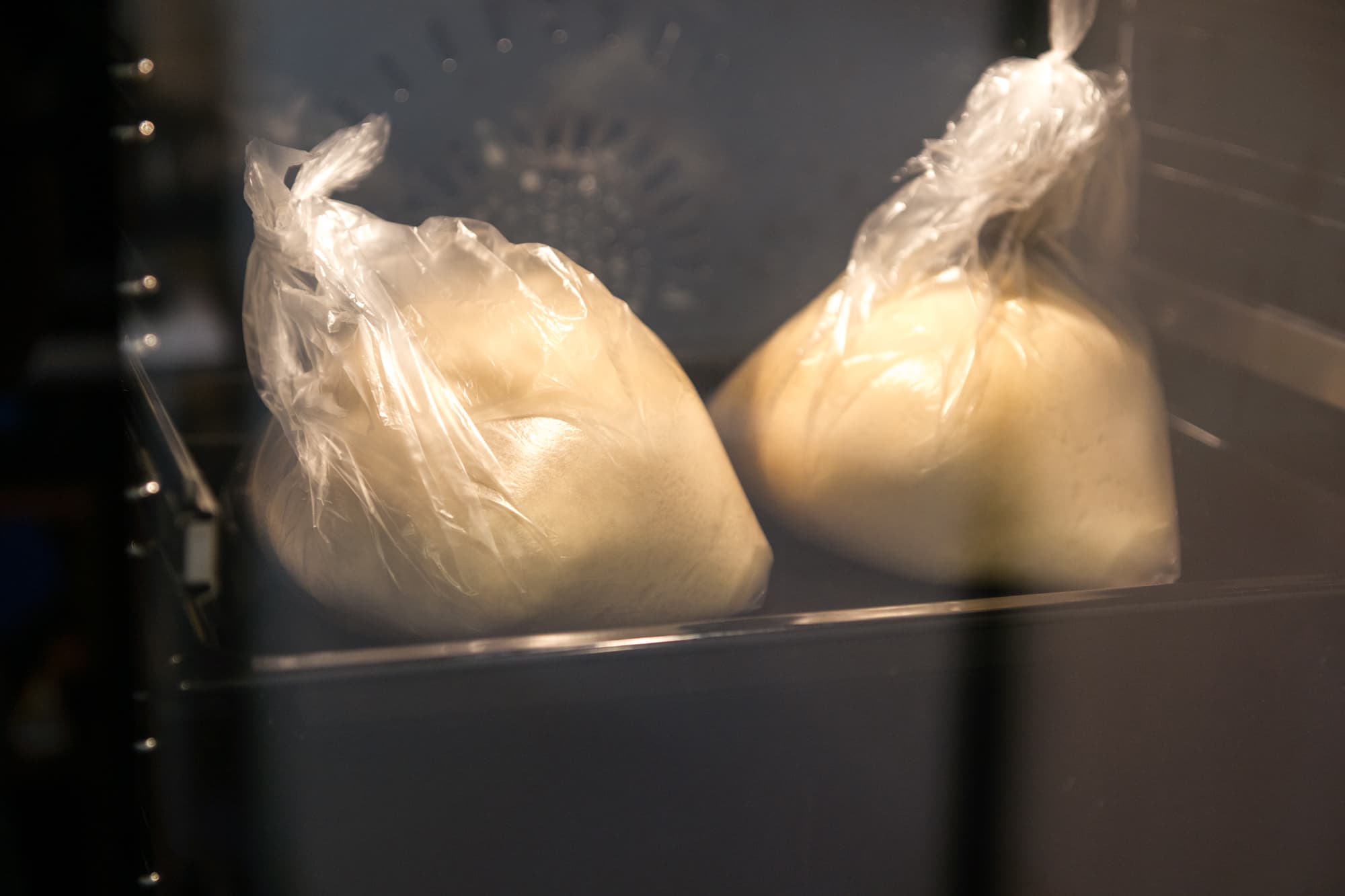 Два шарика дрожжевого теста по 500 г каждый, разморозили в холодильнике до мягкого состояния и отправили в духовку для расстойки при нагреве в 35 °C. Чтобы тесто не обветрилось, каждую порцию уложили в пакет. Через час тесто заметно увеличилось в размере, стало воздушным и пористым.