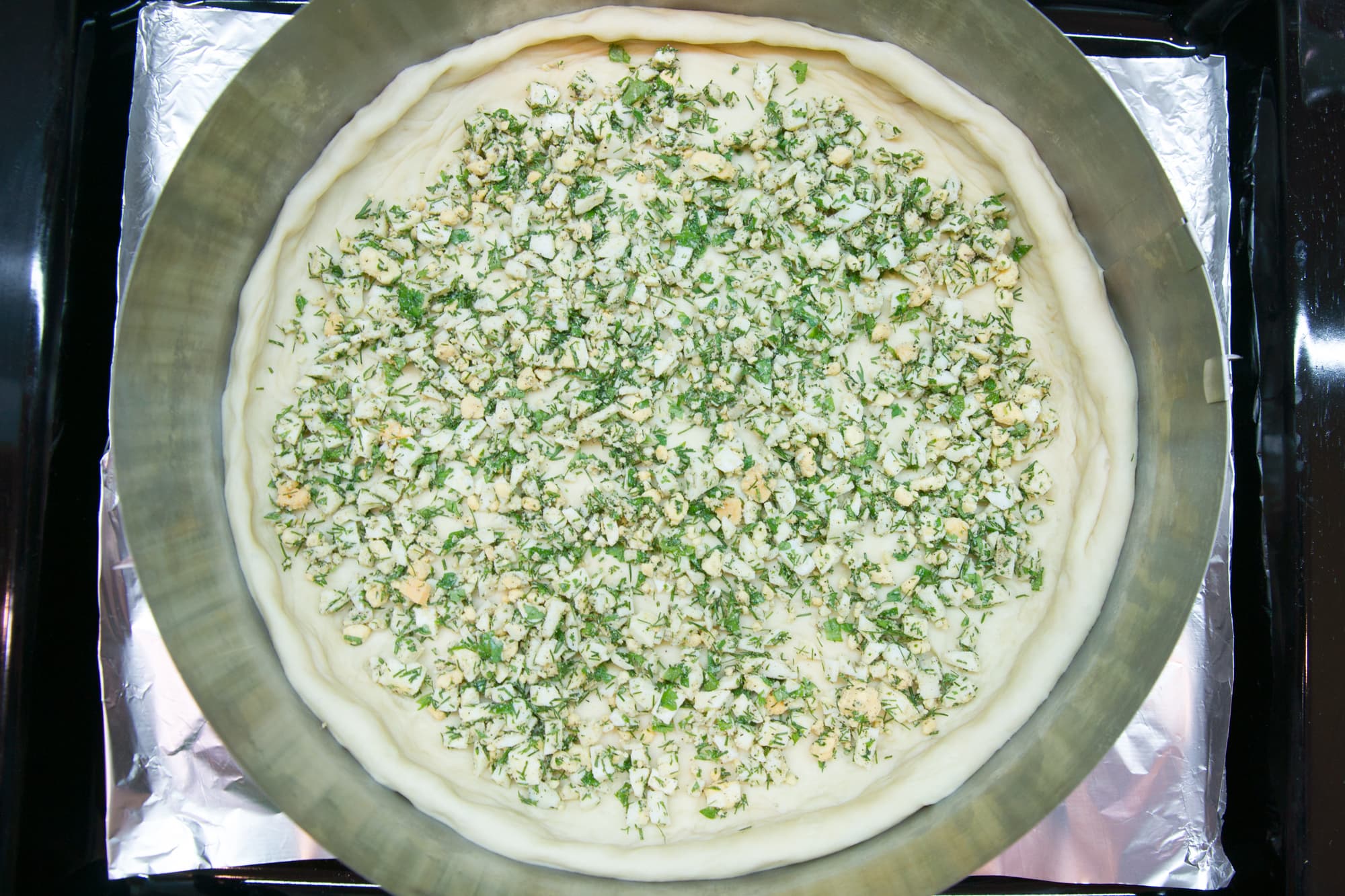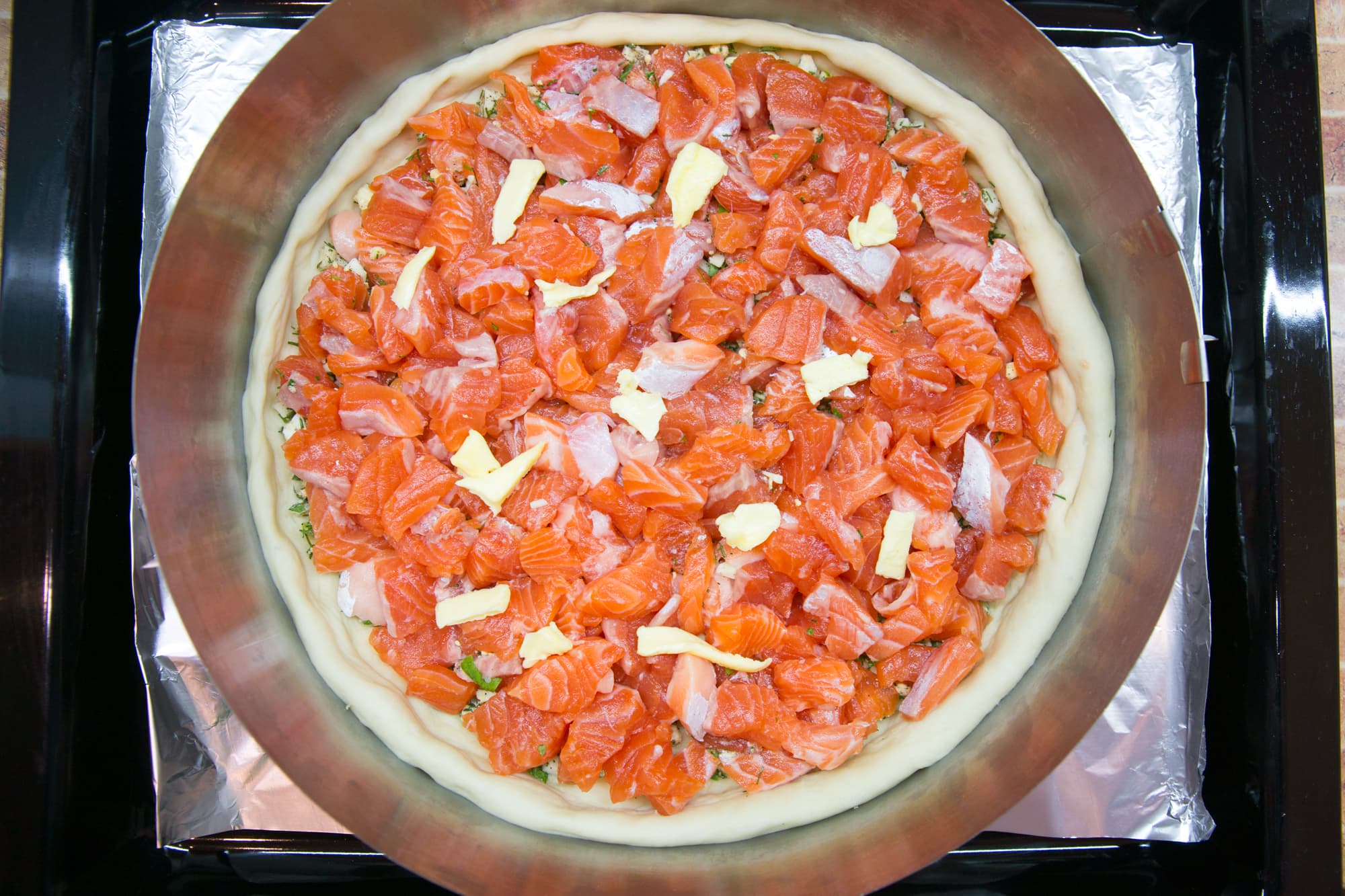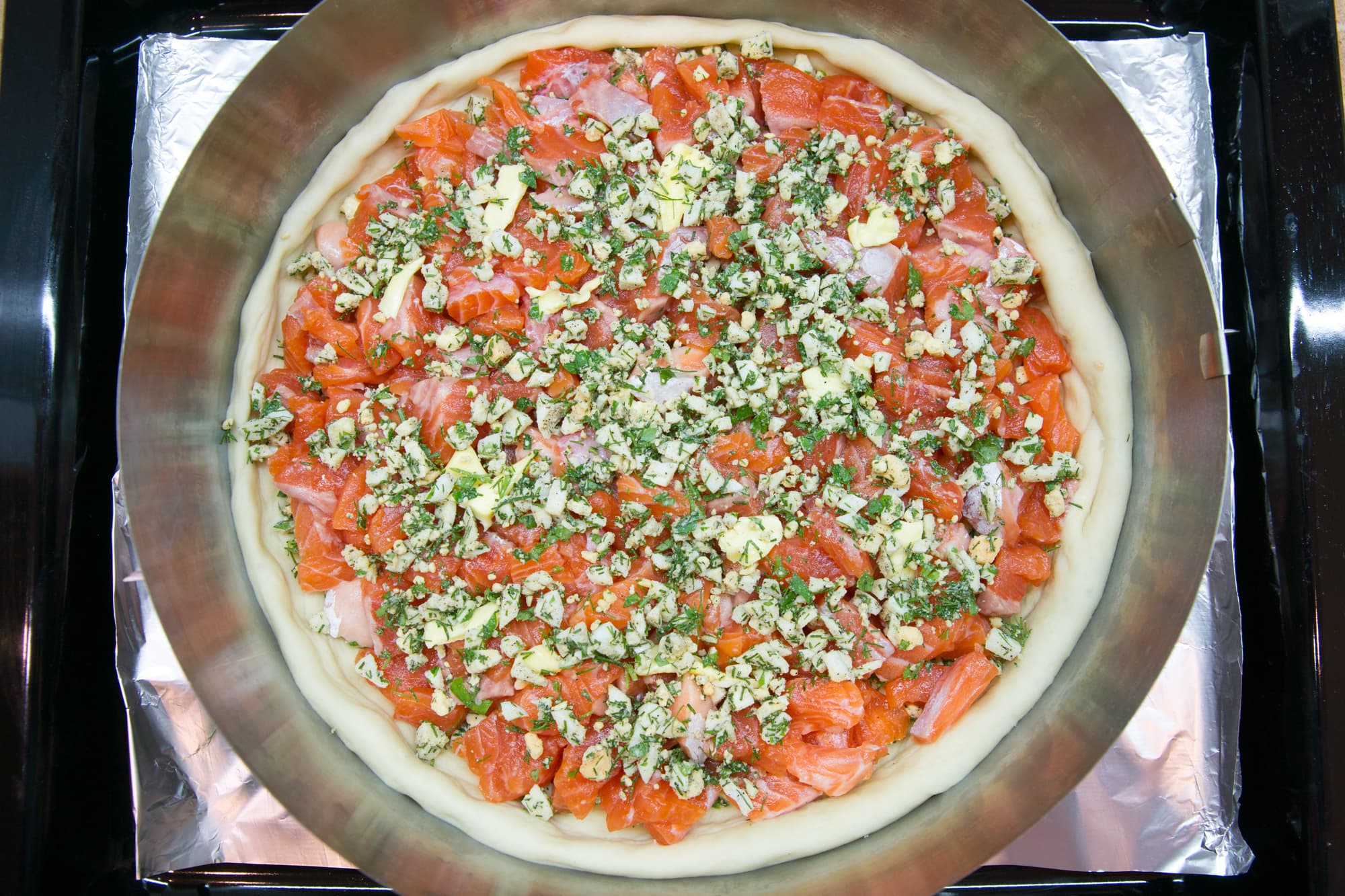 Руками аккуратно растянули первую часть теста и уложили в кольцо на противне, застеленном фольгой. Распределили по поверхности мелко нарезанные вареные яйца с рубленой зеленью, сверху уложили красную рыбу, посолили, поперчили, добавили несколько кусочков сливочного масла и присыпали оставшейся смесью из яиц и зелени.