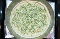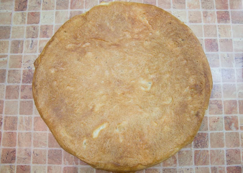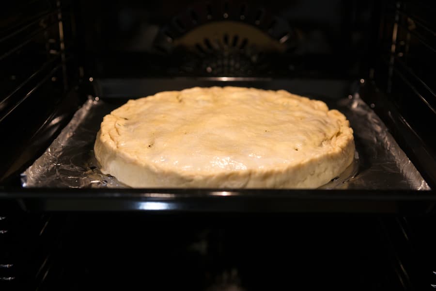 Также вручную растянули вторую часть, накрыли ею начинку и соединили края защипами. Убрали кольцо, сделали надрезы и смазали верхушку молоком. Духовка к этому моменту разогрелась до 180 °C в режиме верхнего и нижнего нагрева.