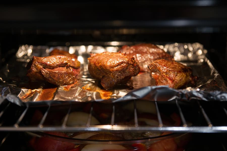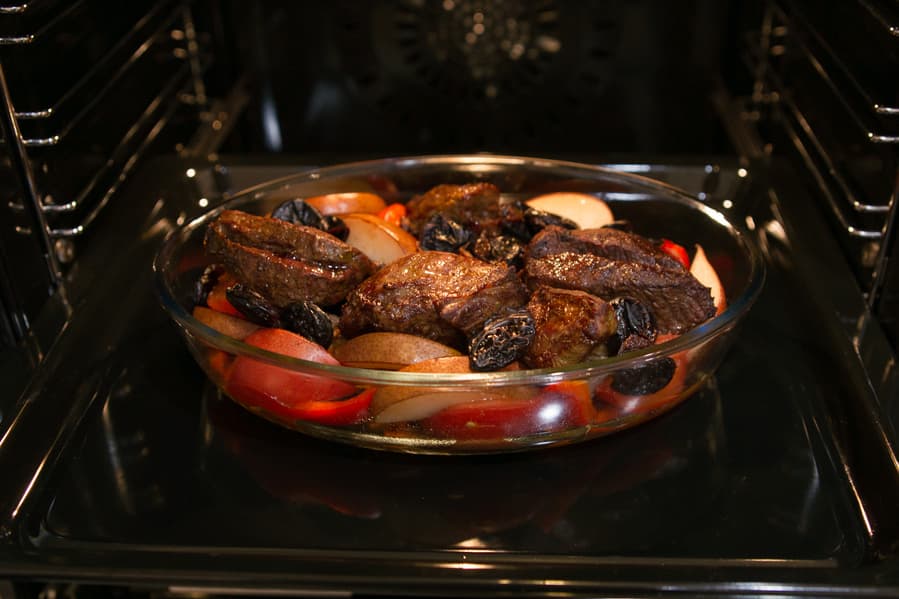 Мясо интенсивно запекалось, в процессе мы перевернули куски один раз, а когда режим сменился на нижний и верхний нагрев, уложили их в форму к овощам и фруктам, подлили полстакана воды и накрыли фольгой. До полной готовности блюдо тушилось около полутора часов.