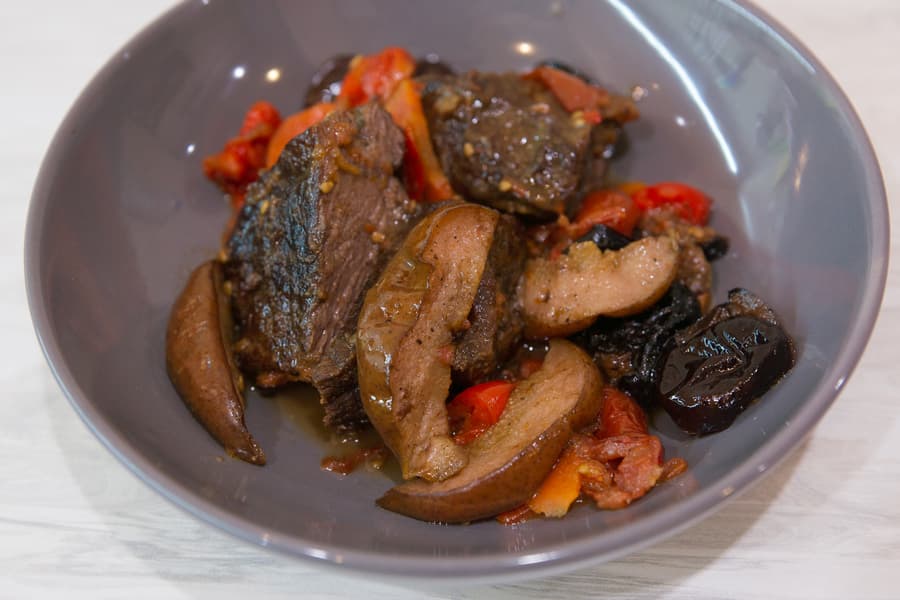 Говядина с овощами, грушей и черносливом
