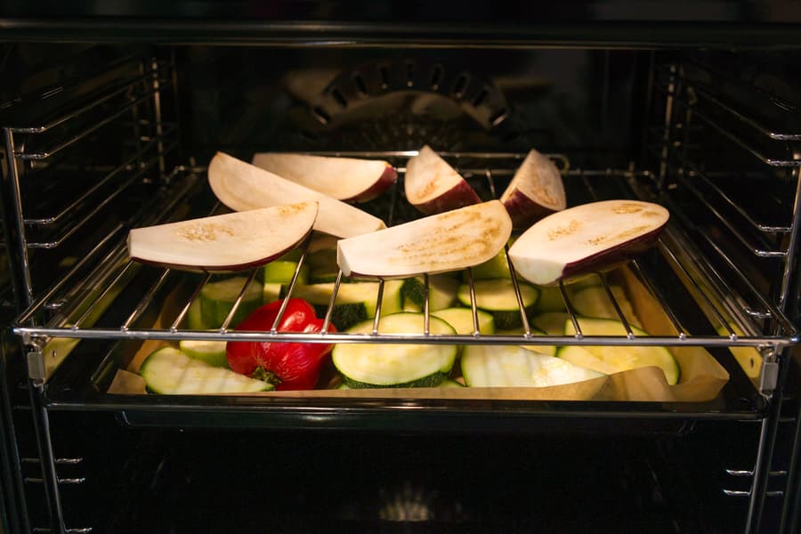Первыми в камеру отправились овощи. Перцы и кабачки уложили на противень. На уровень выше установили решетку с баклажанами.