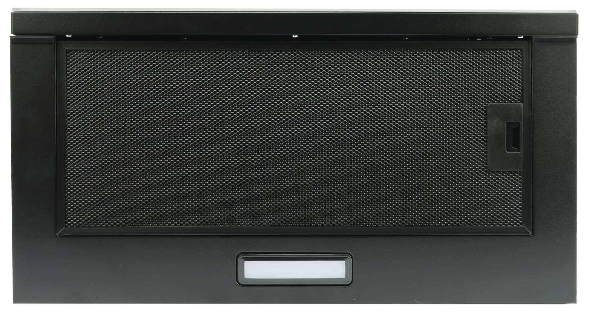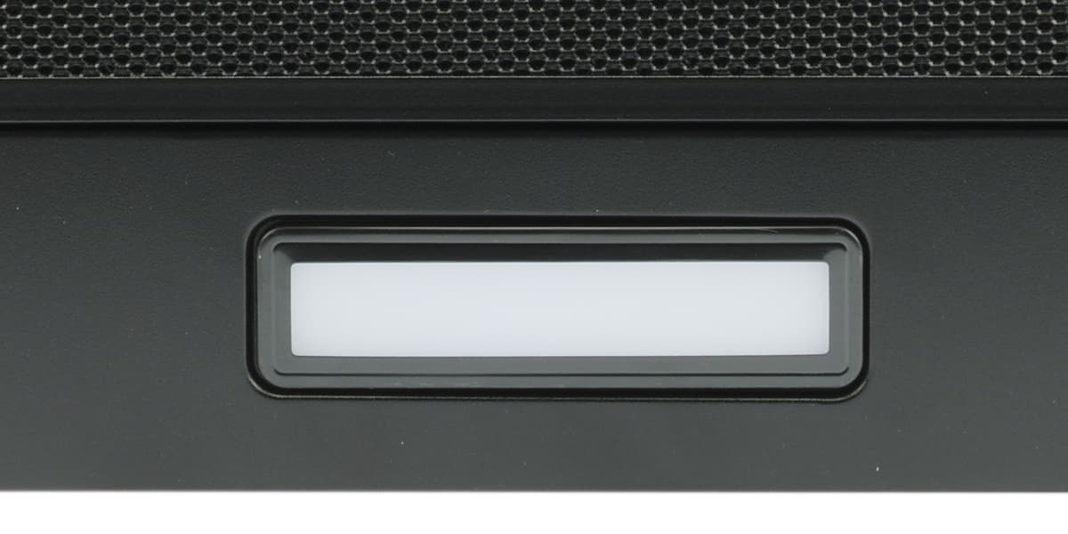 На нижней стороне обращаем внимание на один плафон светодиодной подсветки и алюминиевый антижировой фильтр. Фильтр у нашей вытяжки окрашен в черный цвет. Такое нам, признаться, по нраву: следы жира на черном фоне, по идее, должны быть менее заметны, чем в классическом «металлическом» варианте. С другой стороны — мы любим оттирать фильтры щеткой. Не приведет ли это к сходу краски и потере товарного вида?