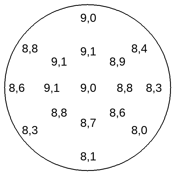 Исходя из полученной средней скорости вычисляется производительность вытяжки в кубометрах воздуха в минуту. Для этой модели результаты измерений выглядели следующим образом (цифры — скорость в метрах в секунду).