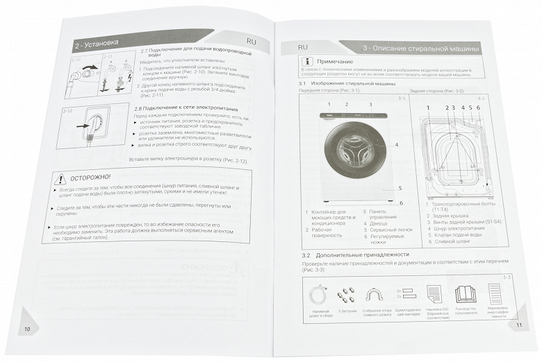 Перед началом эксплуатации стиральную машину следует распаковать, установить и подключить — это общее знание, мы его проговариваем на всякий случай. Освободив устройство от упаковки, нужно не забыть вывинтить четыре транспортировочных болта на задней панели и закрыть отверстия пластиковыми заглушками (ищите их в коробке).