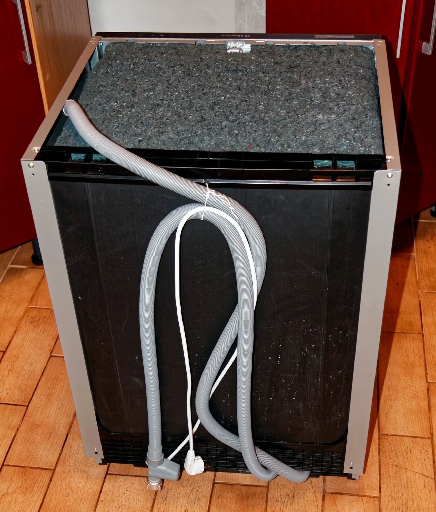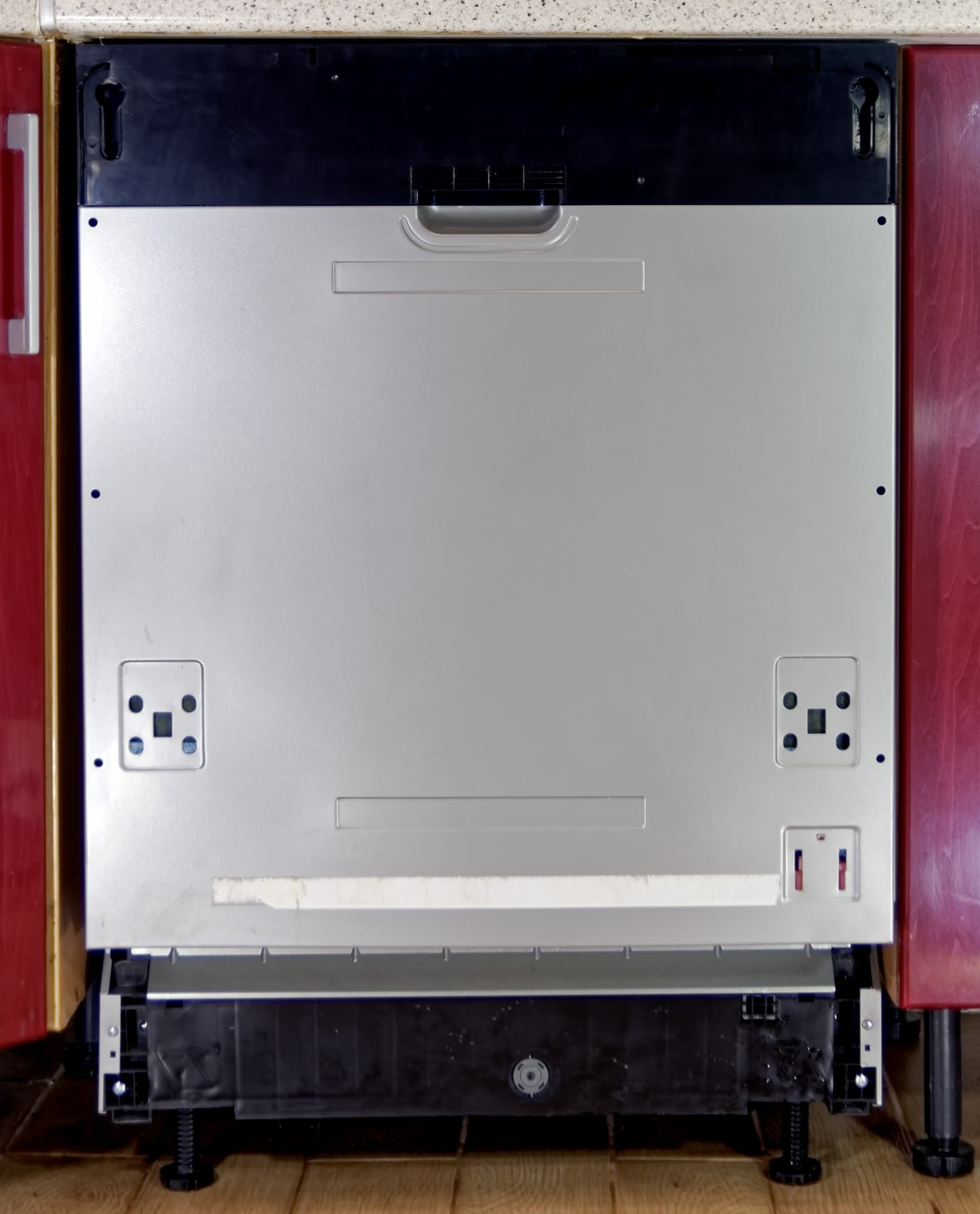 Снаружи дверца посудомойки без декоративной панели выглядит довольно непрезентабельно, но этот вид предназначен для монтажников, а не для пользователей, так что ничего страшного.