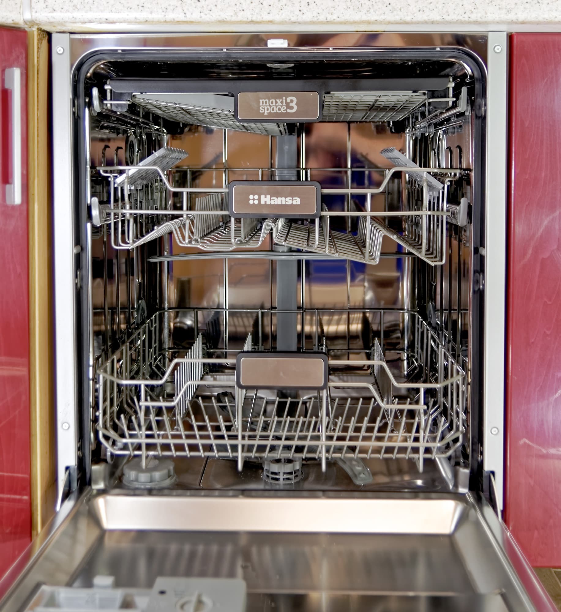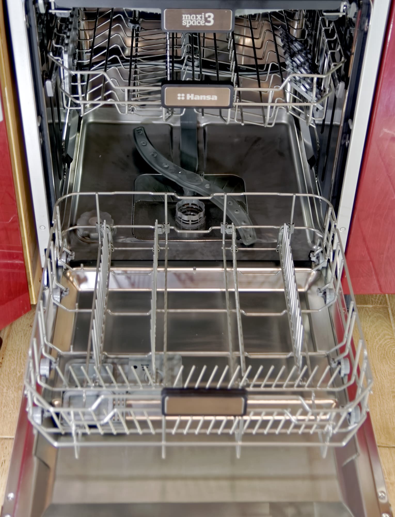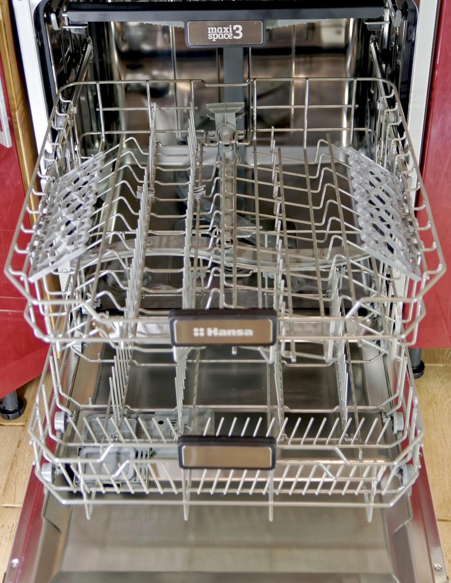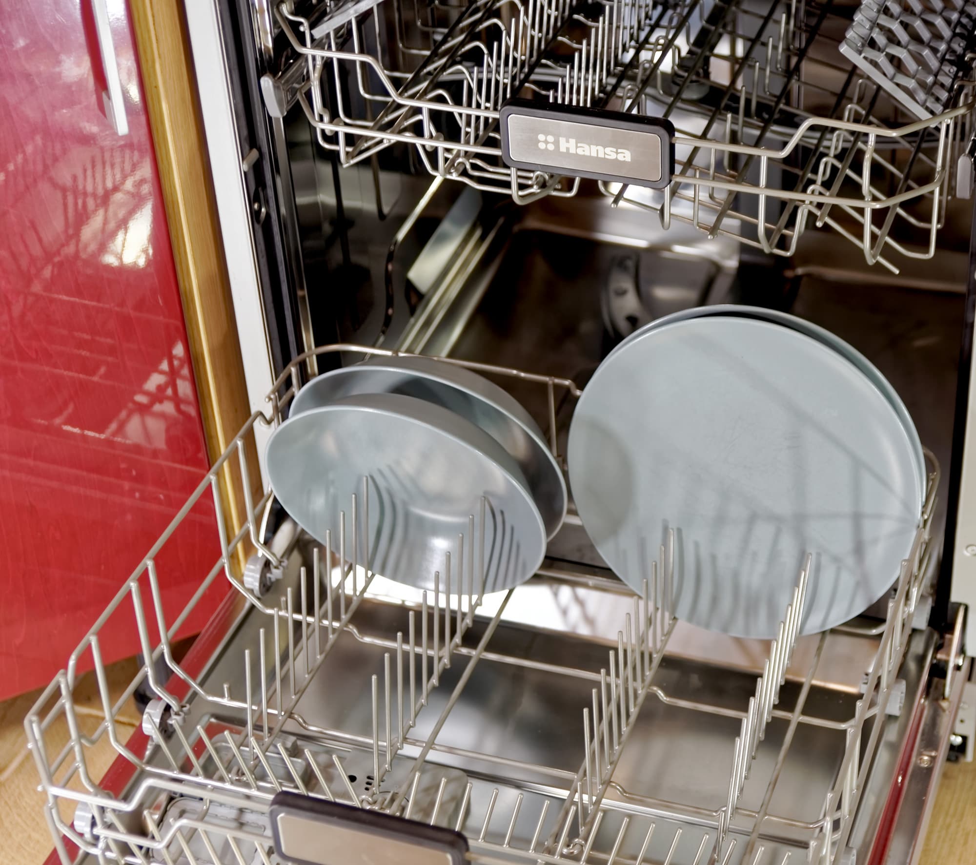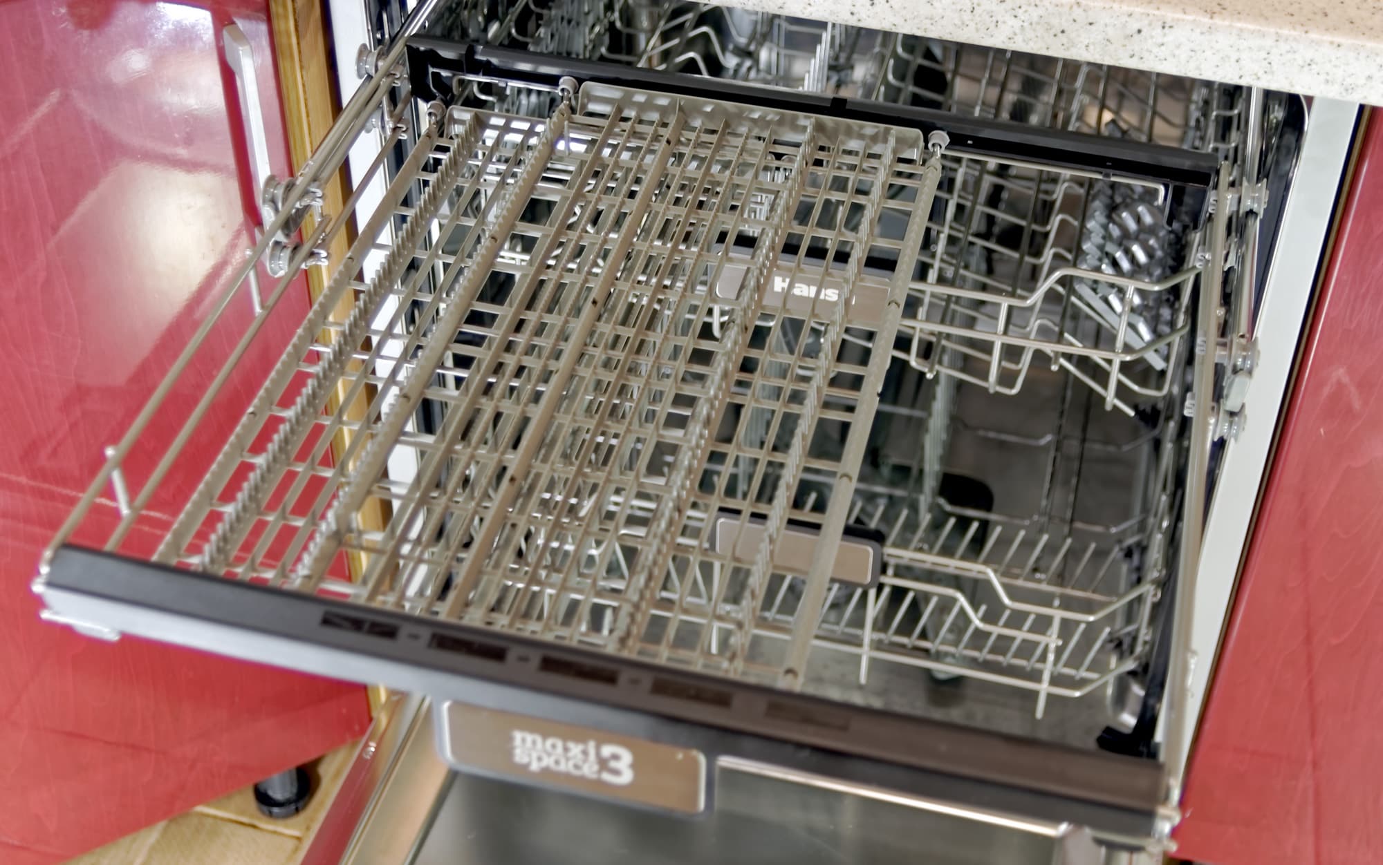Для мытья посуды предусмотрены две выдвигающиеся корзины на колесиках плюс один лоток для мелких столовых приборов на самом верху.