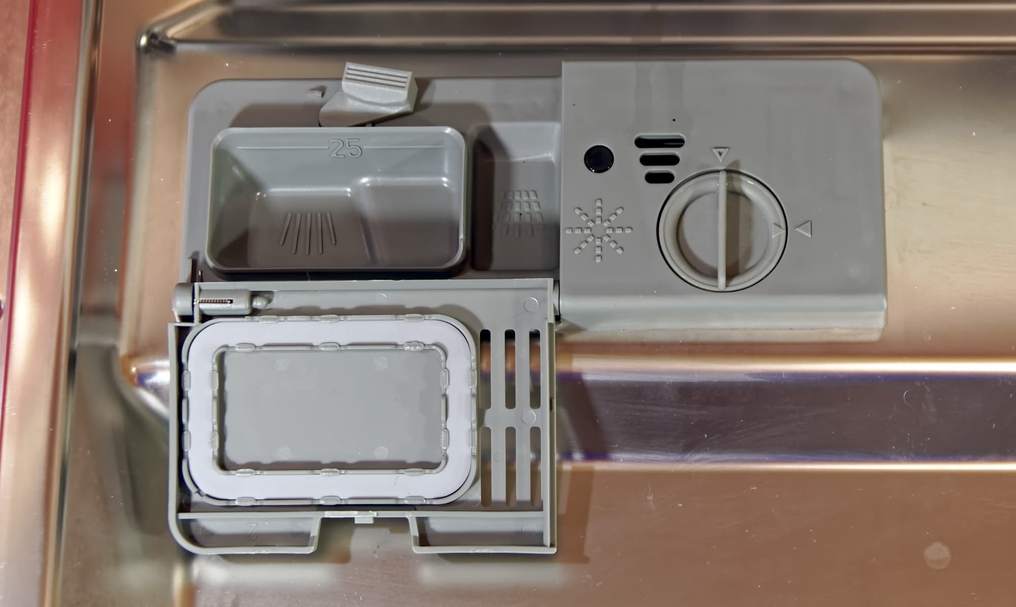 Отсек для моющего средства и дозатор для ополаскивателя находятся на внутренней стороне дверцы. Специальную соль можно загрузить в дозатор, расположенный на дне посудомоечной машины.