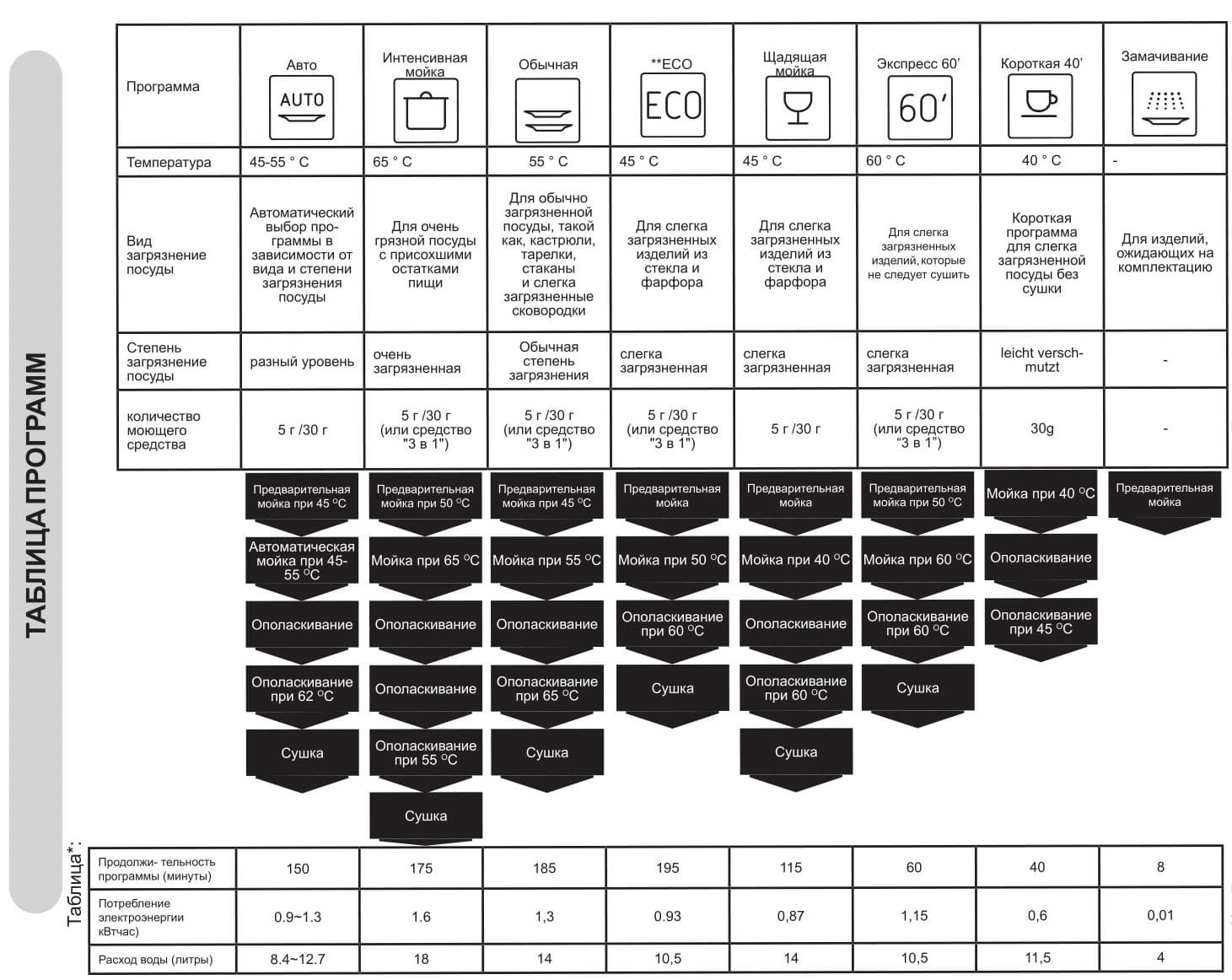 Всего в посудомойке есть 8 программ, предназначенных для различных типов посуды и различной степени загрязнения. В инструкции имеется понятная и подробная таблица, описывающая эти программы. Для простоты приведем ее в нашей статье и заодно отметим наличие непереведенных фрагментов и опечаток — об этом мы уже упоминали ранее.