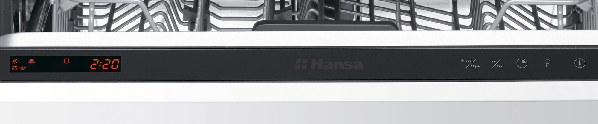Открыв дверцу, мы можем увидеть «закрытую» панель управления и экран с индикаторами, расположенные на верхнем торце дверцы. Кнопки используются сенсорные, индикатор — яркий и хорошо заметный. Посудомойка имеет встроенную подсветку, которая автоматически включается при открывании дверцы.