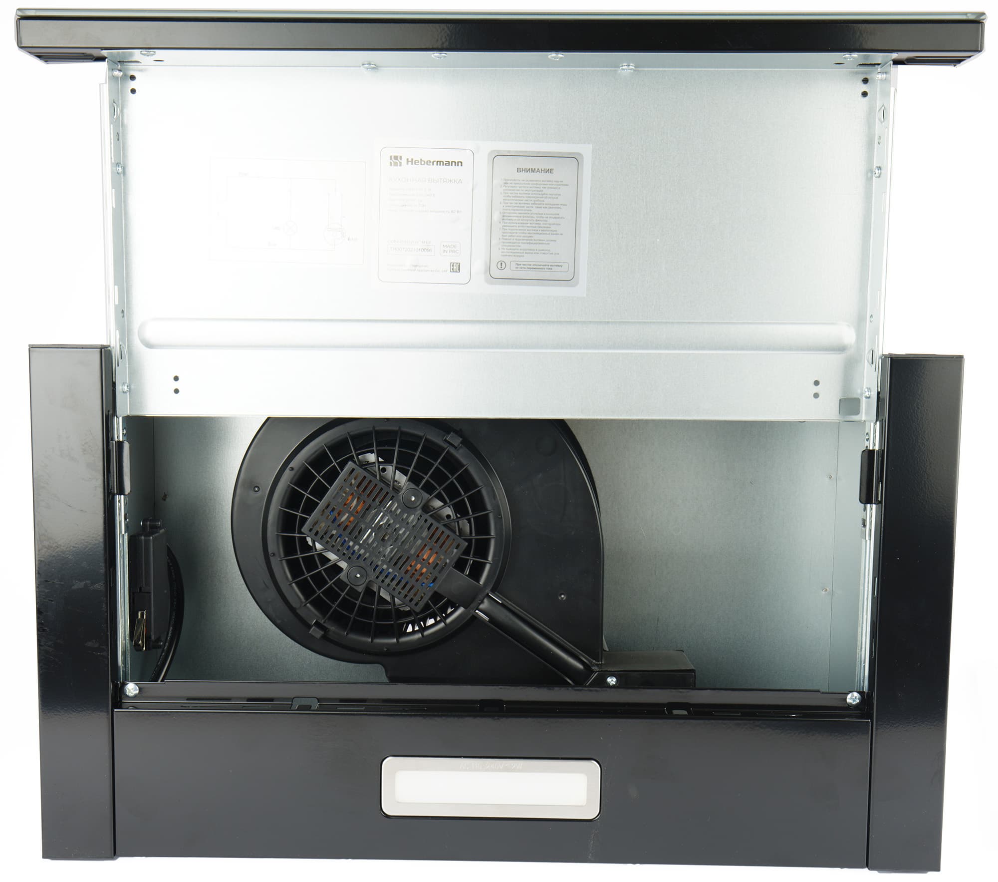 Внутренняя поверхность выдвижной части глухая: работает вытяжка только в разложенном состоянии. Под антижировыми фильтрами расположена улитка центробежного вентилятора. У него нет посадочных мест для опционального угольного фильтра: в отличие от недавно рассмотренной нами модели того же производителя, вытяжка Hebermann HBFH 50.2 B рассчитана на подключение к вытяжной вентиляции и не может использоваться как отдельно стоящий воздухоочиститель.