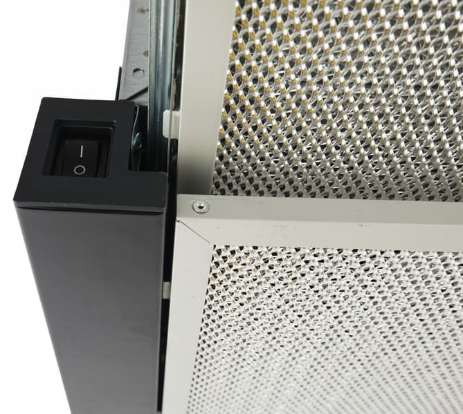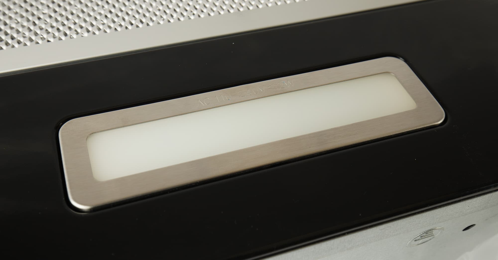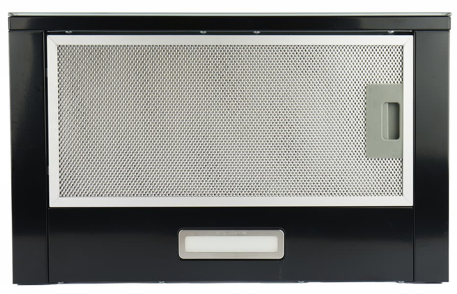 Передняя кромка выдвижной части украшена черной стеклянной полосой с белым логотипом производителя — это единственный декоративный элемент прибора. Верхняя часть корпуса вытяжки выполнена из неокрашенного алюминия: модель рассчитана на встраивание в кухонный гарнитур.