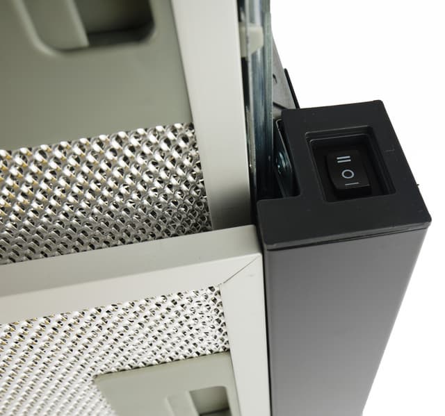 Правый переключатель трехпозиционный, управляет мотором вентилятора. У Hebermann HBFH 50.2 B только две скорости, а среднее положение выключает вытяжку.