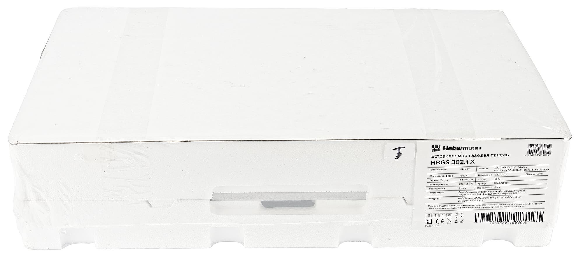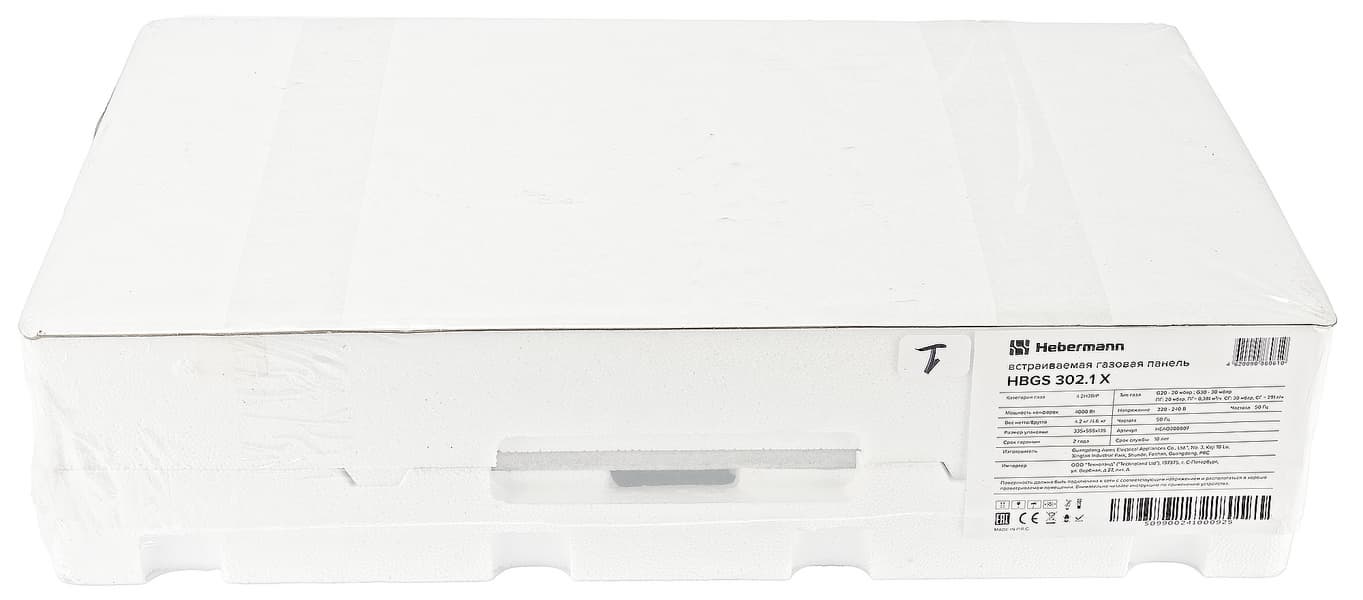 Варочная поверхность поставляется в упаковке из двух пенопластовых ложементов, скрепленных прочной пленкой. На одной из боковых граней есть наклейка с информацией об устройстве.
