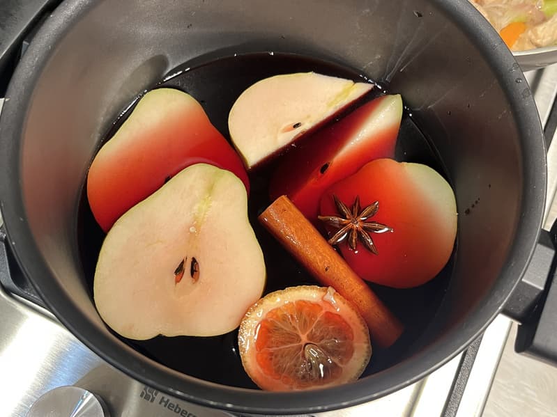 Вылили вино в кастрюлю, добавили к нему отвар, грушу и вернули палочку корицы, анис и апельсин (для красоты, так как свой вкус они уже отдали в отвар).