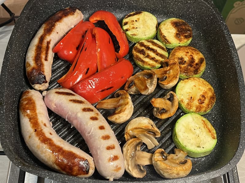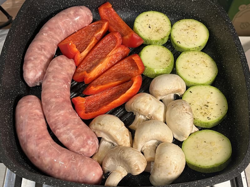 Купаты, шампиньоны и овощи на гриль-сковороде