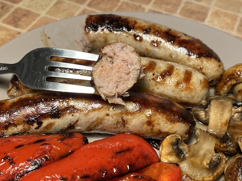Мы сняли овощи с огня спустя еще 3 минуты, а купаты покрутили на сковороде еще в течение 4 минут, чтобы они обжарились со всех сторон. Итог нас порадовал: продукты приобрели румяные корочки и аромат, а колбаски отлично пропеклись и при этом остались сочными внутри.