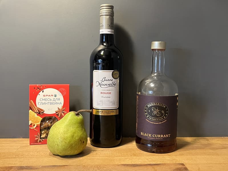 Для приготовления самого ароматного зимнего напитка мы подготовили безалкогольное красное вино, смесь пряностей, грушу и черносмородиновый сироп.