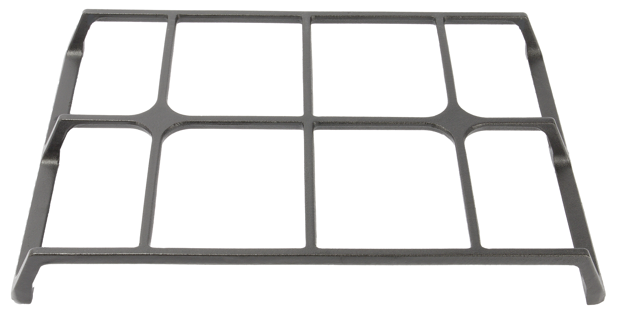 Увесистая решетка с чугунным напылением устойчиво держится на поверхности плиты. Чтобы не поцарапать металлическую поверхность, предусмотрены специальные накладки с нижней стороны решетки.