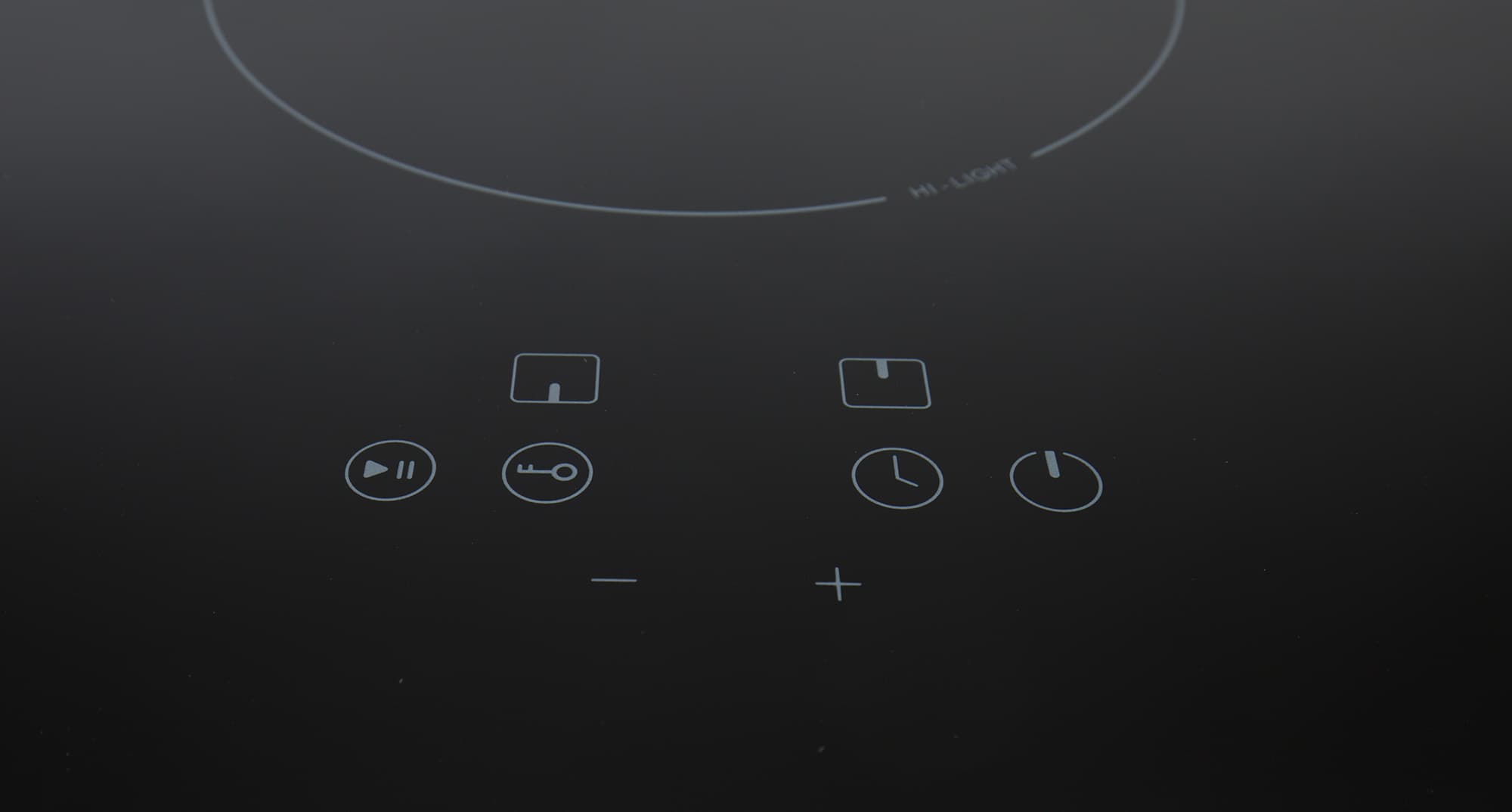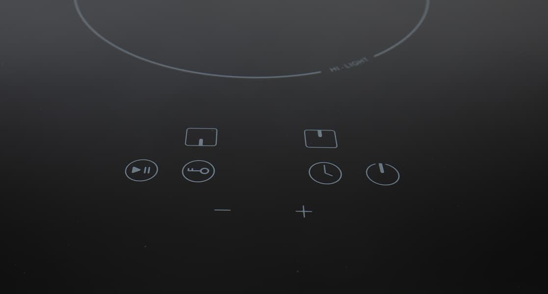 Панель управления расположена внизу ровно посередине. Она выглядит понятно даже без инструкции — круглые сенсорные кнопки, начиная с «Пауза, Плей» говорят сам за себя, «Ключ» явно означает блокировку панели, по значку «Часы» можем понять, что речь идет о таймере, и последняя кнопка очевидно «Вкл./Выкл.». Над круглыми кнопками мы видим рисунки с расположением конфорок, а под круглыми кнопками остаются знаки «+» и «−».