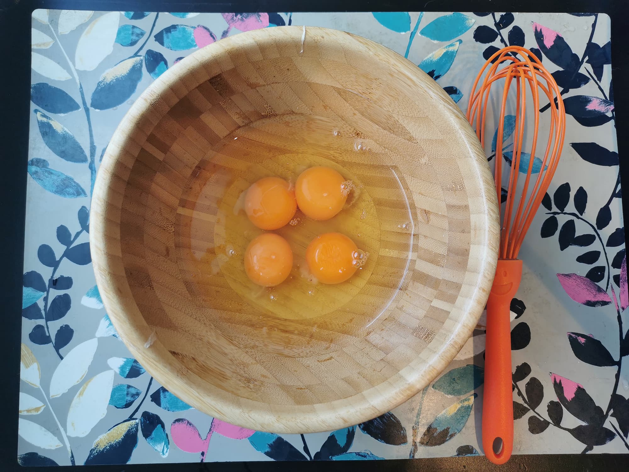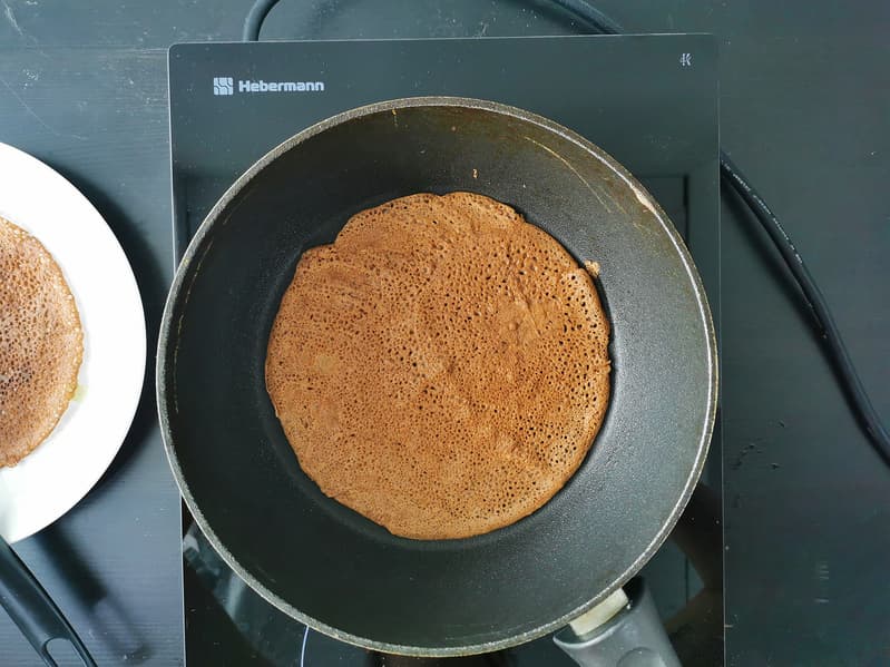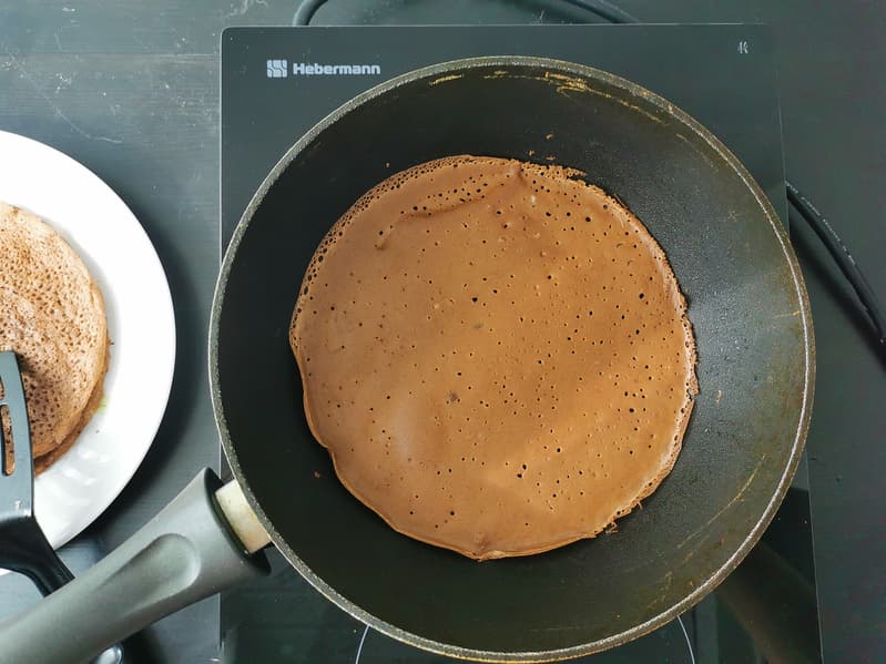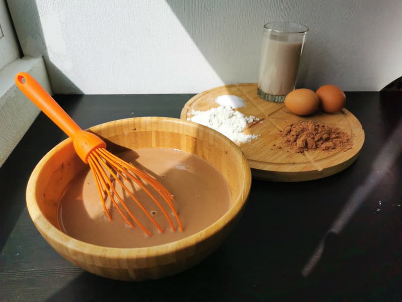Для блинчиков мы в этот раз использовали необычные ингредиенты: какао, растительное молоко «Кешью-Фундук» для орехового аромата, пшеничную муку, натуральный сахарозаменитель и фермерские яйца.