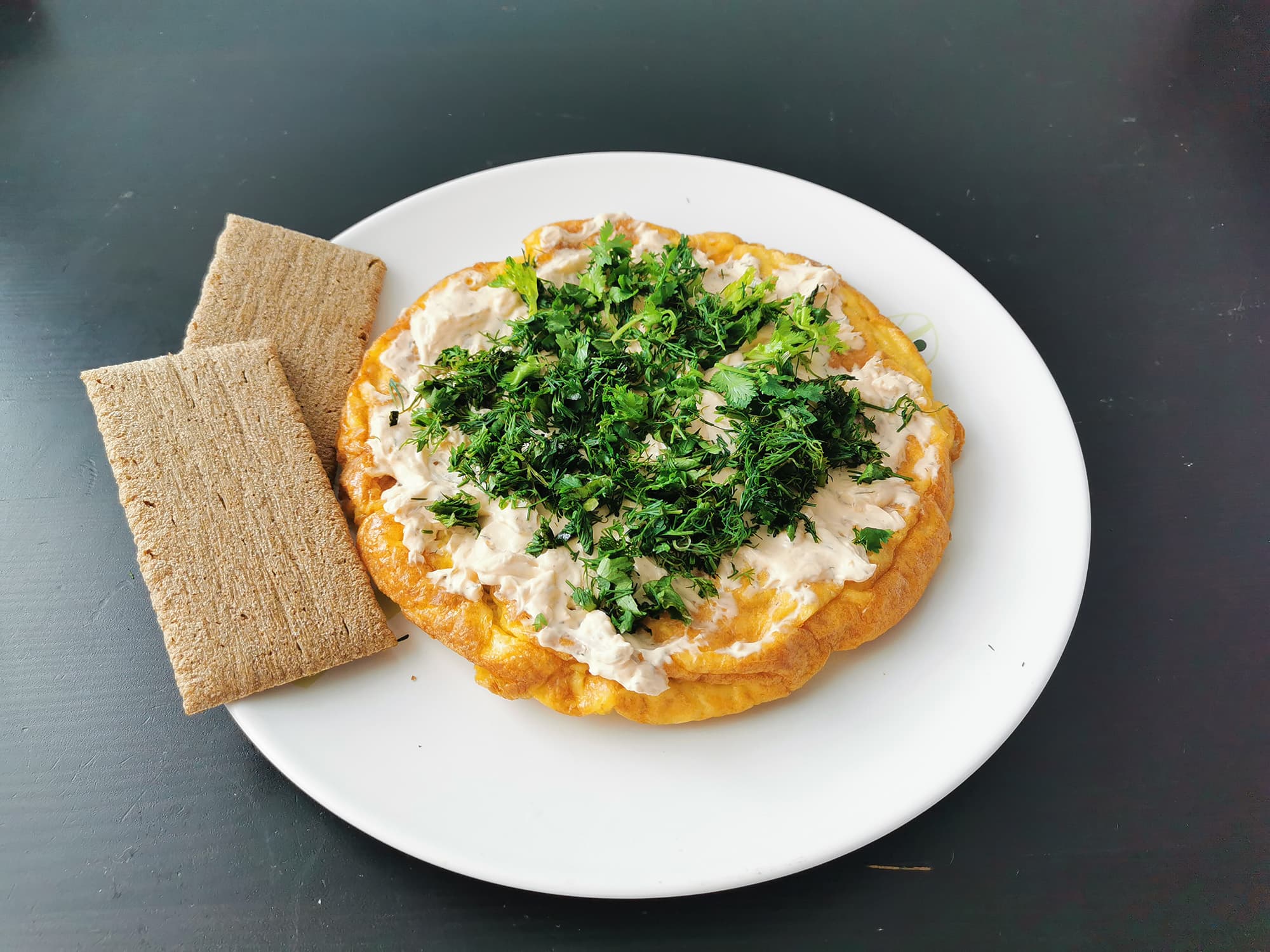 Когда все важные пункты в приготовлении омлета выполнены, результат не заставит себя ждать — омлет будет воздушным и очень вкусным. Мы украсили его творожным сыром и зеленью.