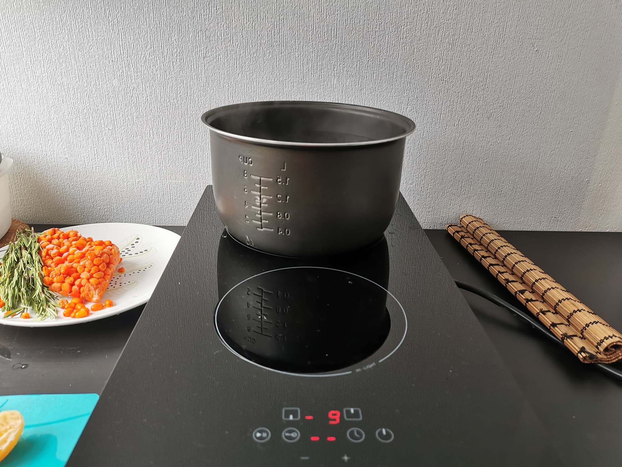 На фото вы можете увидеть процесс закипания воды в чаше на 9-м режиме на большой верхней конфорке.