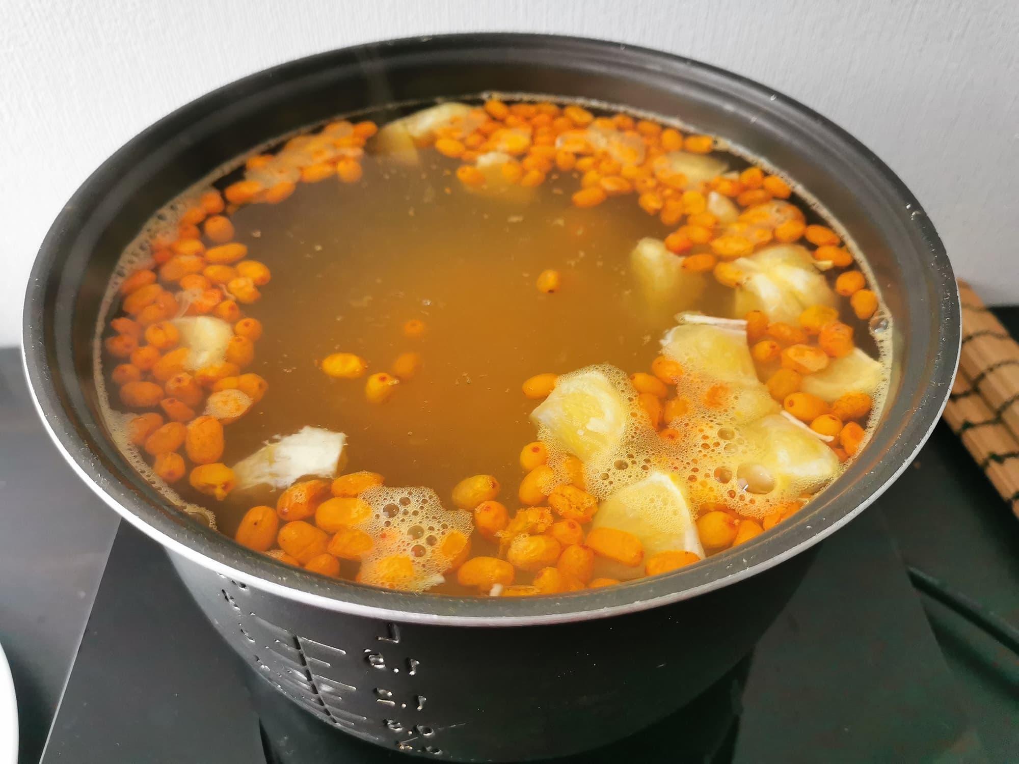 Мы сложили все ингредиенты в горячую воду и следили за компотом вплоть до его закипания.