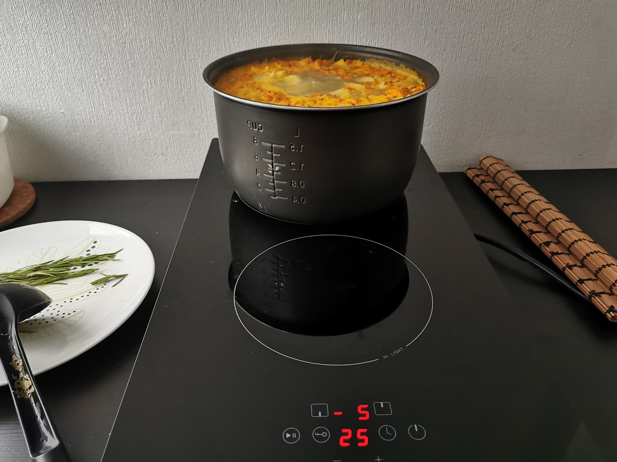Для первого теста мы решили попробовать приготовить щавелевый суп, а заодно протестировать таймер и возможности плитки в поддержании медленного кипения.