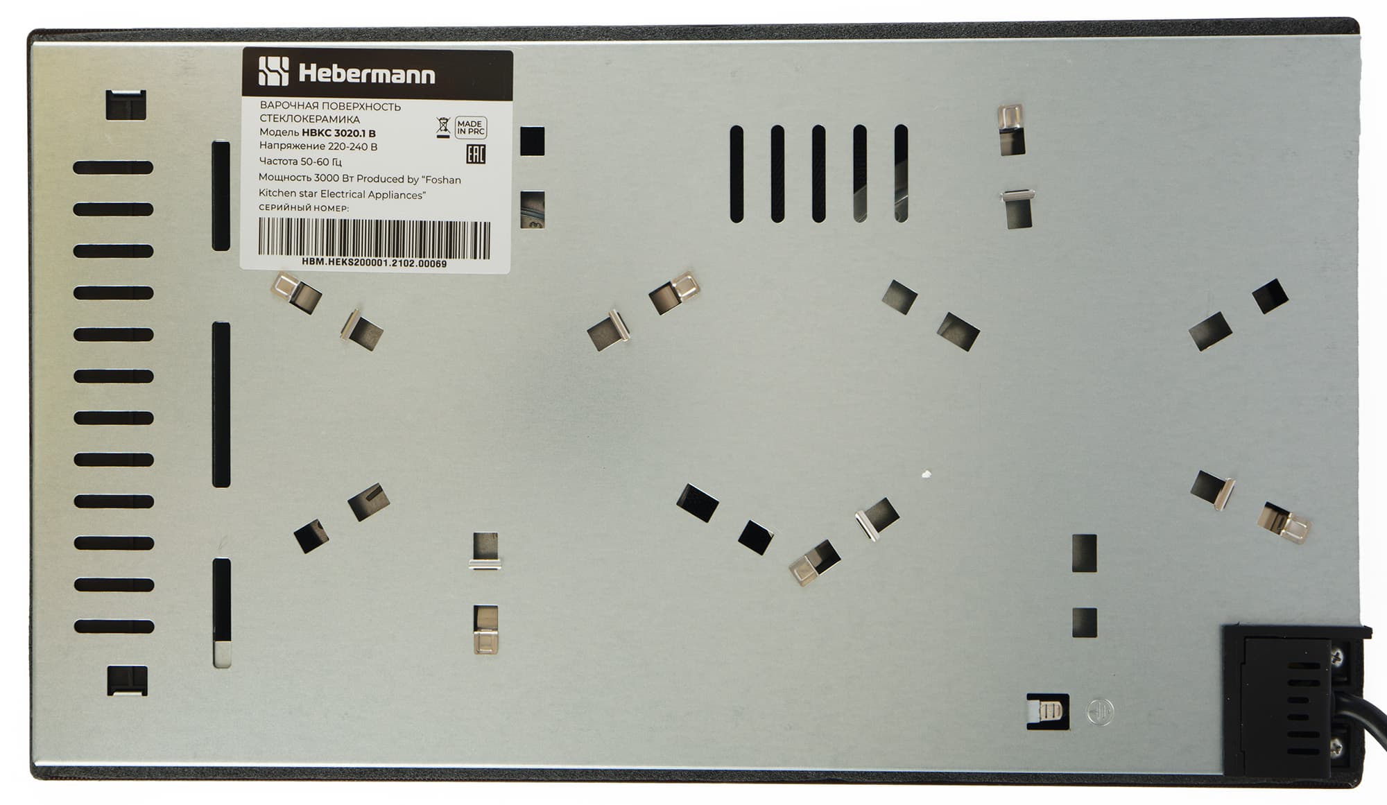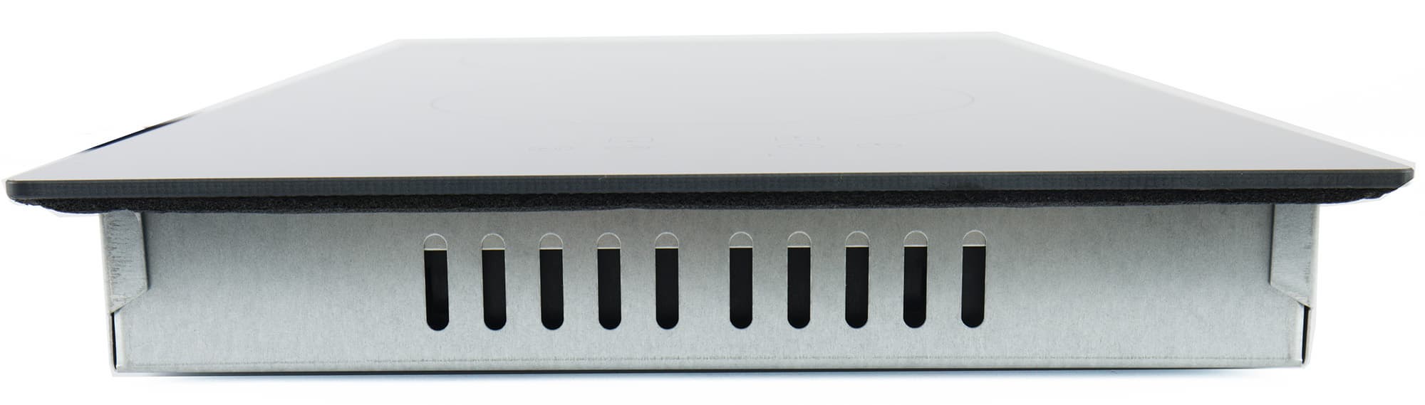 По периметру с обратной стороны стеклокерамики прикреплен уплотнитель шириной около сантиметра. На металлических боковых сторонах имеются отверстия и пазы для размещения крепежа.