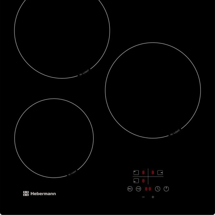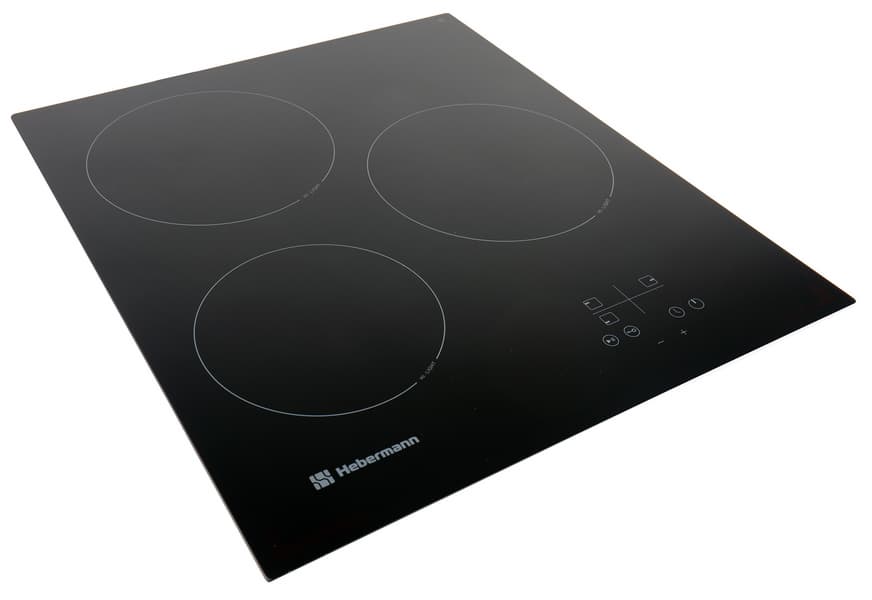 У нас не тестировании электрическая варочная поверхность Hebermann HBKC 4530.1: трехконфорочная плита для встраивания со стеклокерамической поверхностью глубокого черного цвета. По размерам это средний вариант между стандартными плитами 60×60 с четырьмя конфорками и небольшими плитками для тех, кто готовит редко или мало. Посмотрим, для кого может оказаться оптимальным этот прибор.