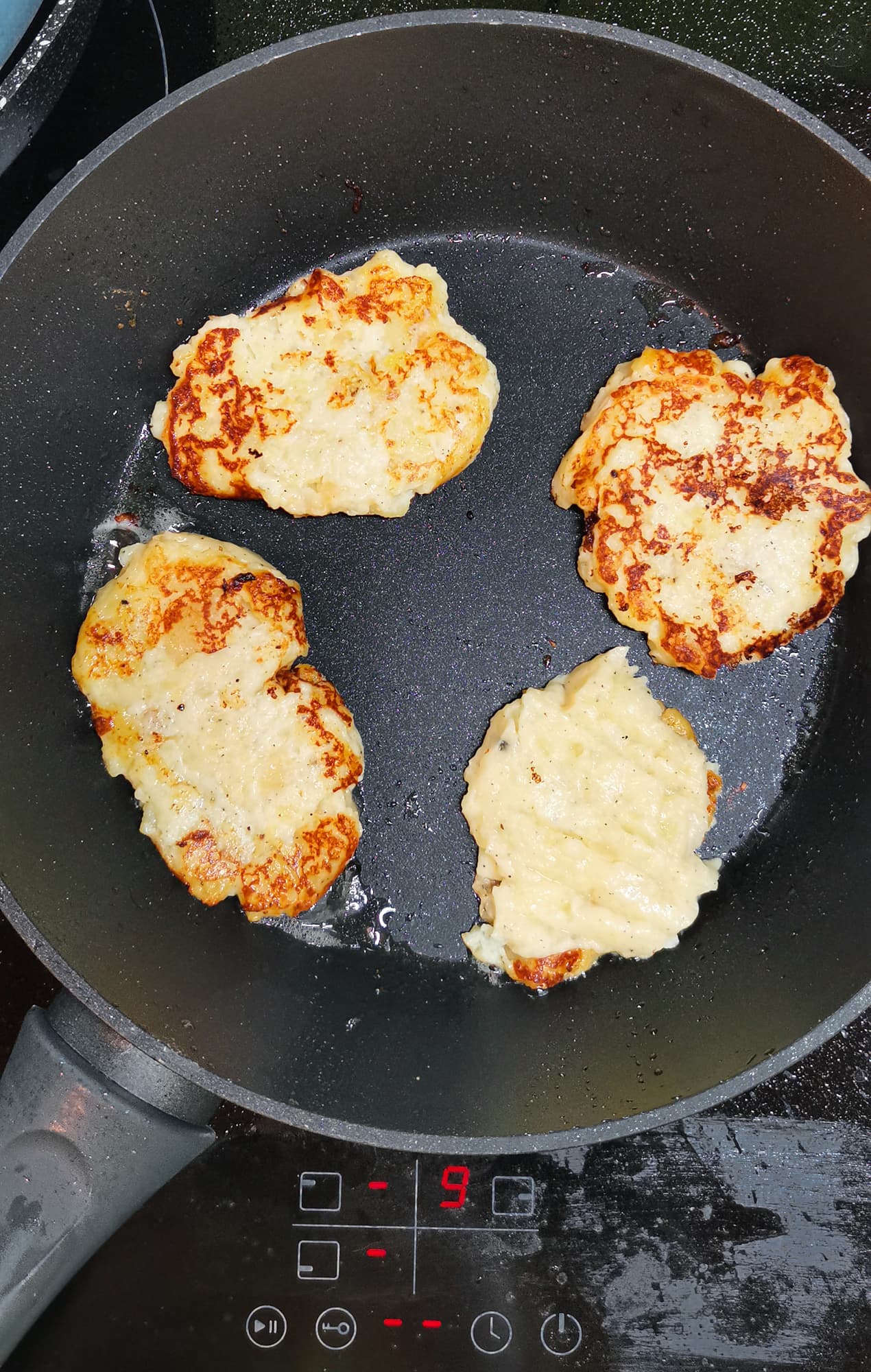 Из вареной картошки, муки и яйца мы приготовили тесто для оладий. Жарили на антипригарной сковородке на большой конфорке на максимальном нагреве.