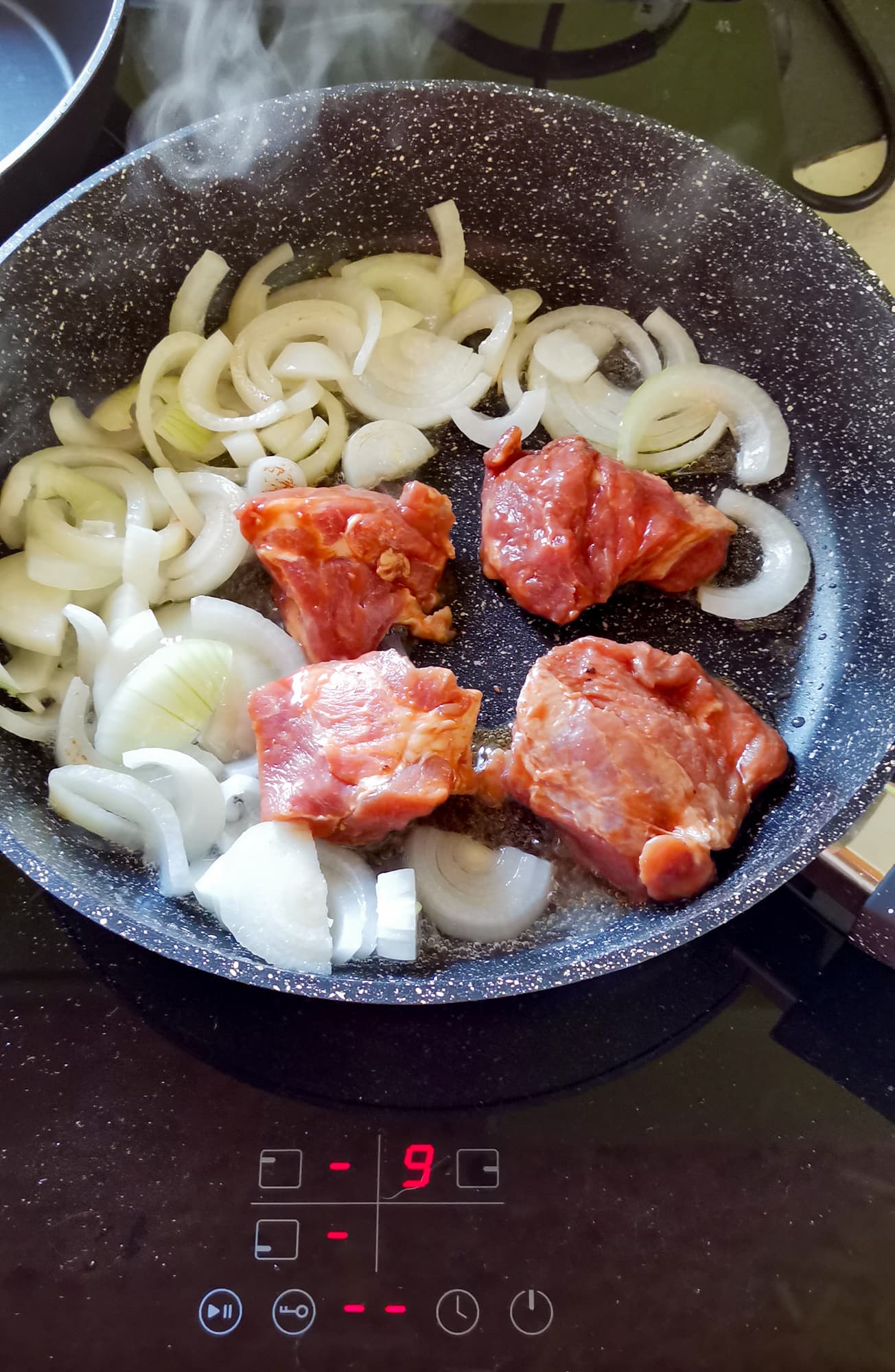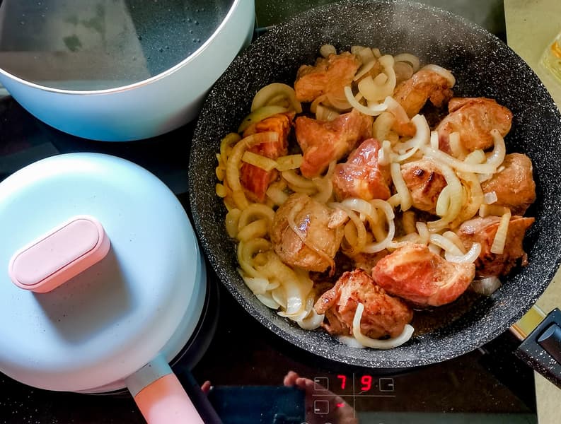 Свинина с луком скорее тушилась, чем обжаривалась — для хорошей обжарки такого количества мяса не хватило уровня нагрева. Если на этой плите делать стейк или вок, требующей высокой температуры, нужно выбирать сковородку большого диаметра с толстым дном и класть меньшие куски, тогда результат будет достигнут. Мы разложили порцию мяса в две сковородки и тогда получили нужный результат.
