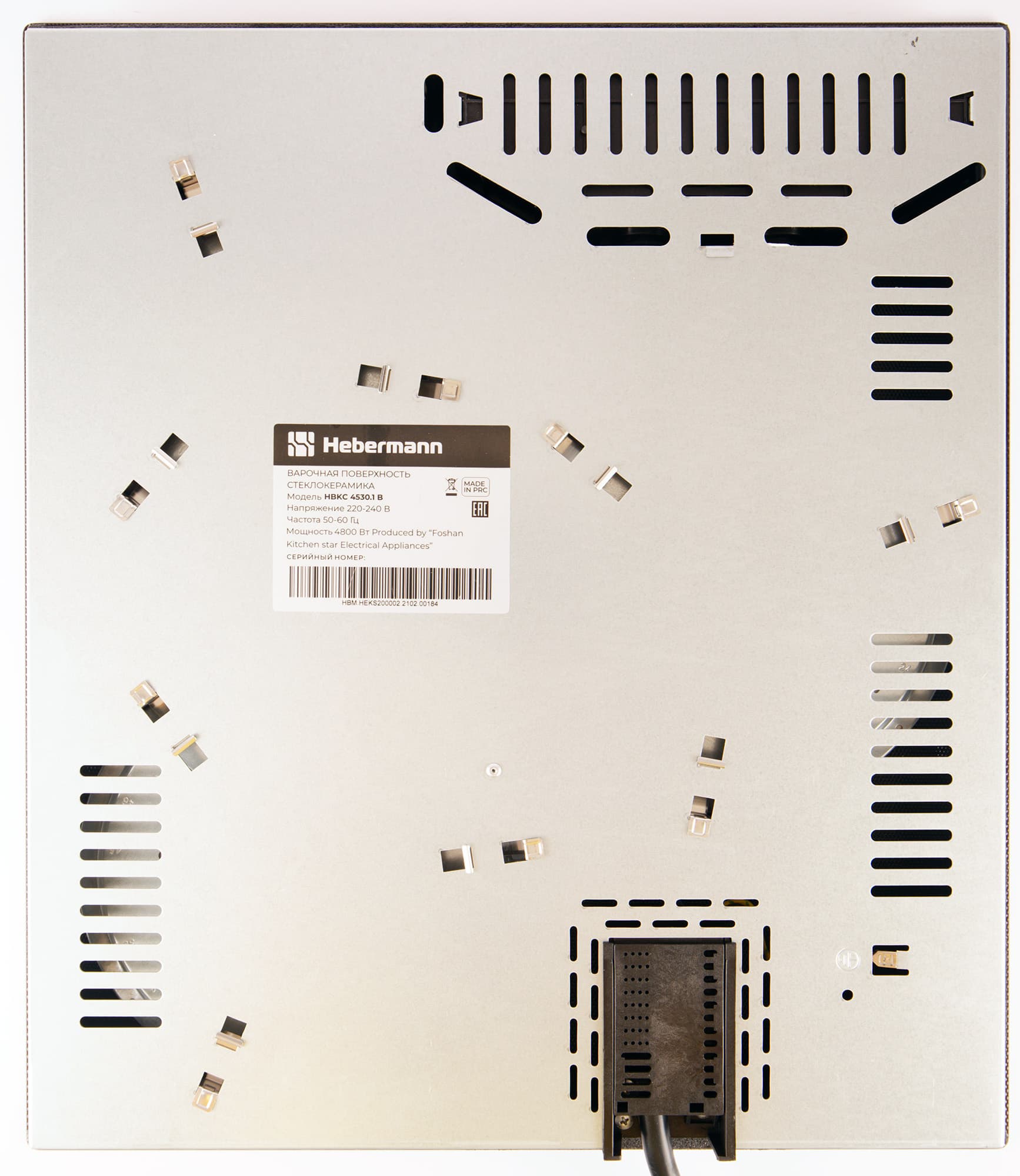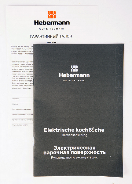 Электрическая варочная поверхность Hebermann HBKC 4530.1 приехала на тесты в коробке из толстого технического картона. На коробке монохромная печать — фотография прибора, его технические характеристики и служебные пиктограммы. Снаружи коробка дополнительно затянута полипропиленовой лентой, ручек и прорезей конструкцией не предусмотрено, а внутри поверхность надежно зафиксирована пенопластовыми вставками.