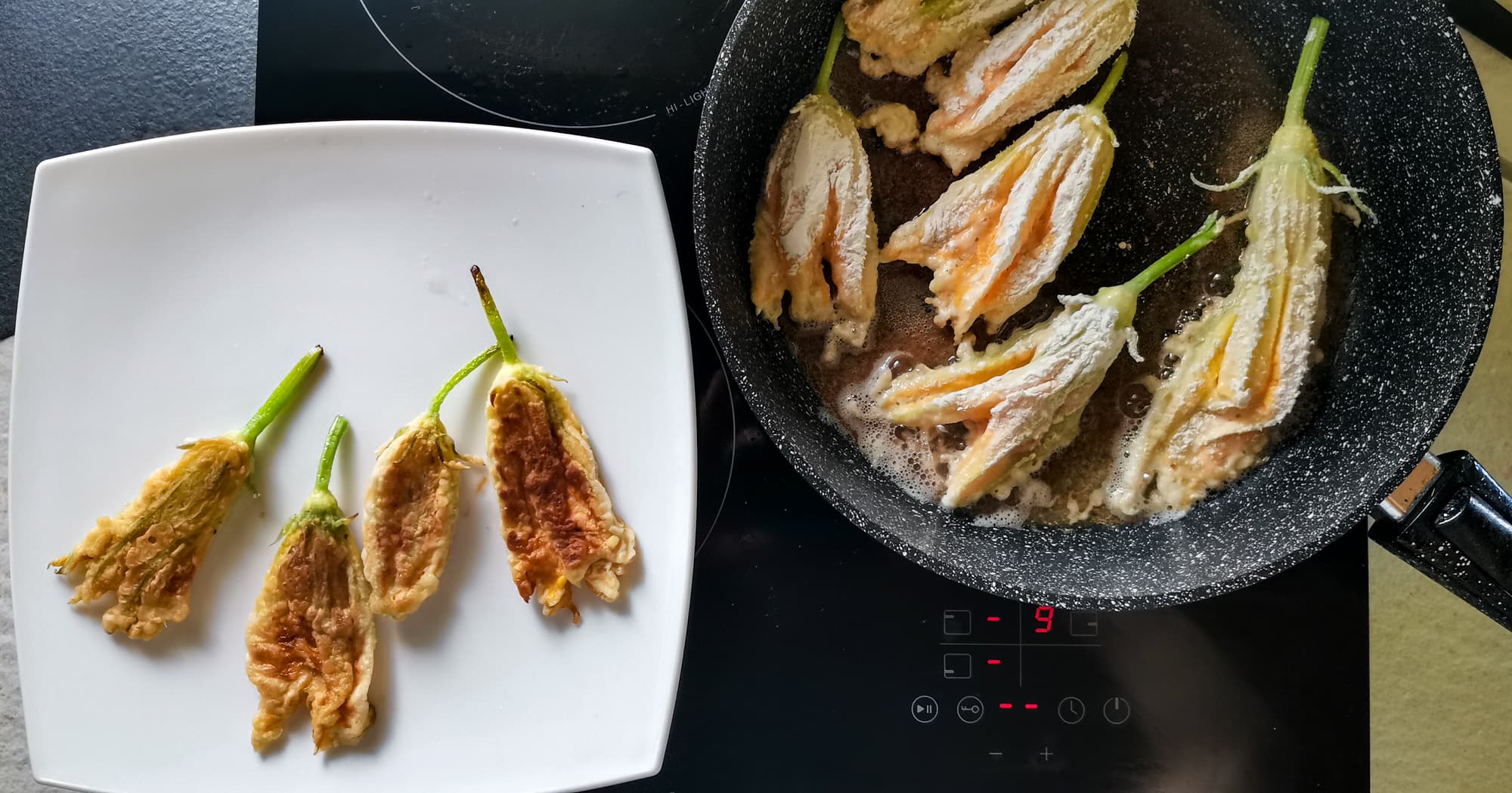 В каждый цветок положили немного моцареллы с лавандой и перцем, обмакнули в яичный кляр, обваляли в муке. Жарили на сковородке диаметром 26 см при максимальной мощности на масле с базиликом.