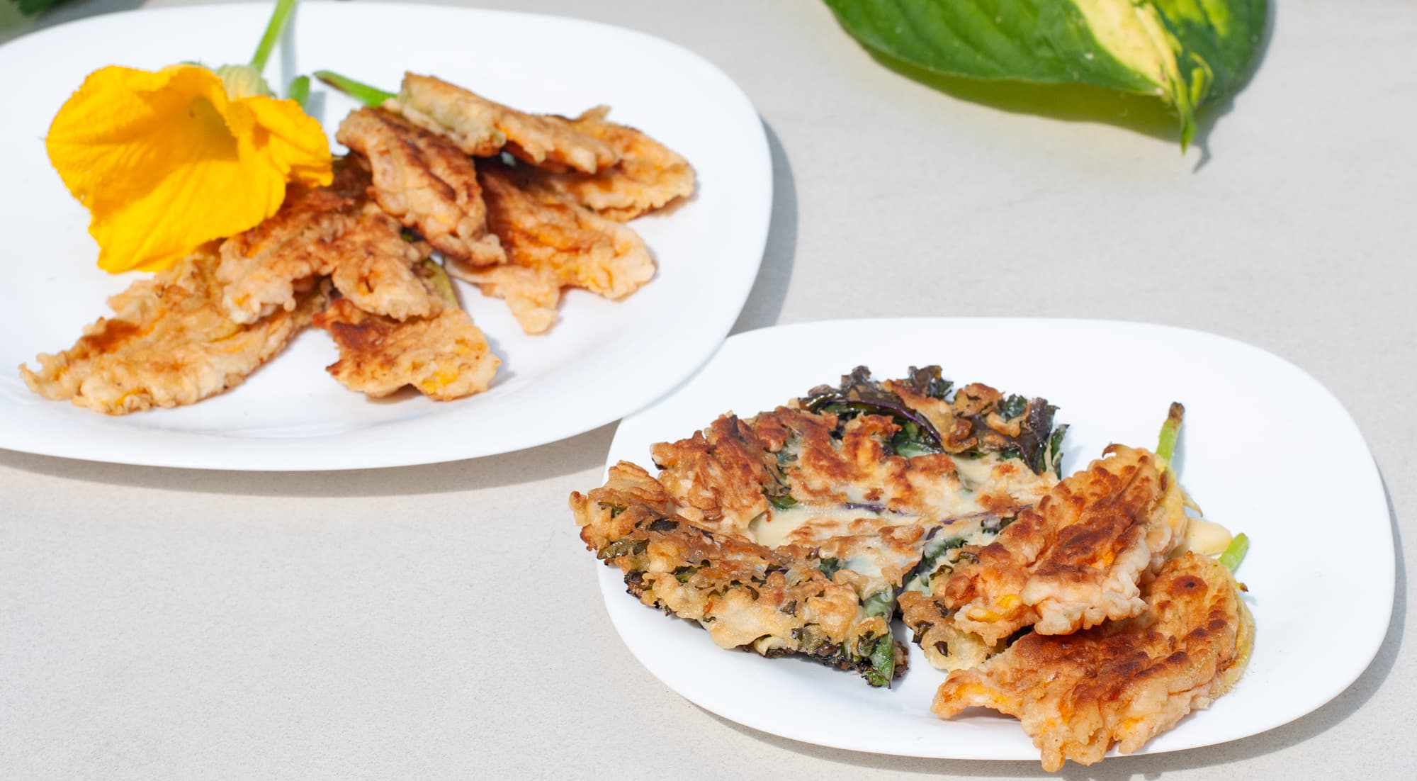 Кейл обмакнули в кляр и тоже обжарили. Цветы подали на листьях кейла.