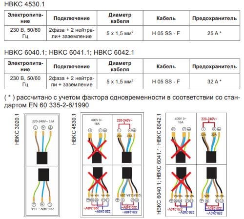 Для подключения плиты к электросети (стандартные 230 В) используется необычный пятижильный кабель: провод заземления, два нулевых и два фазовых провода, это дает возможность, при необходимости, подсоединить плиту сразу к двум предохранительным автоматам — для снижения нагрузки на сеть.