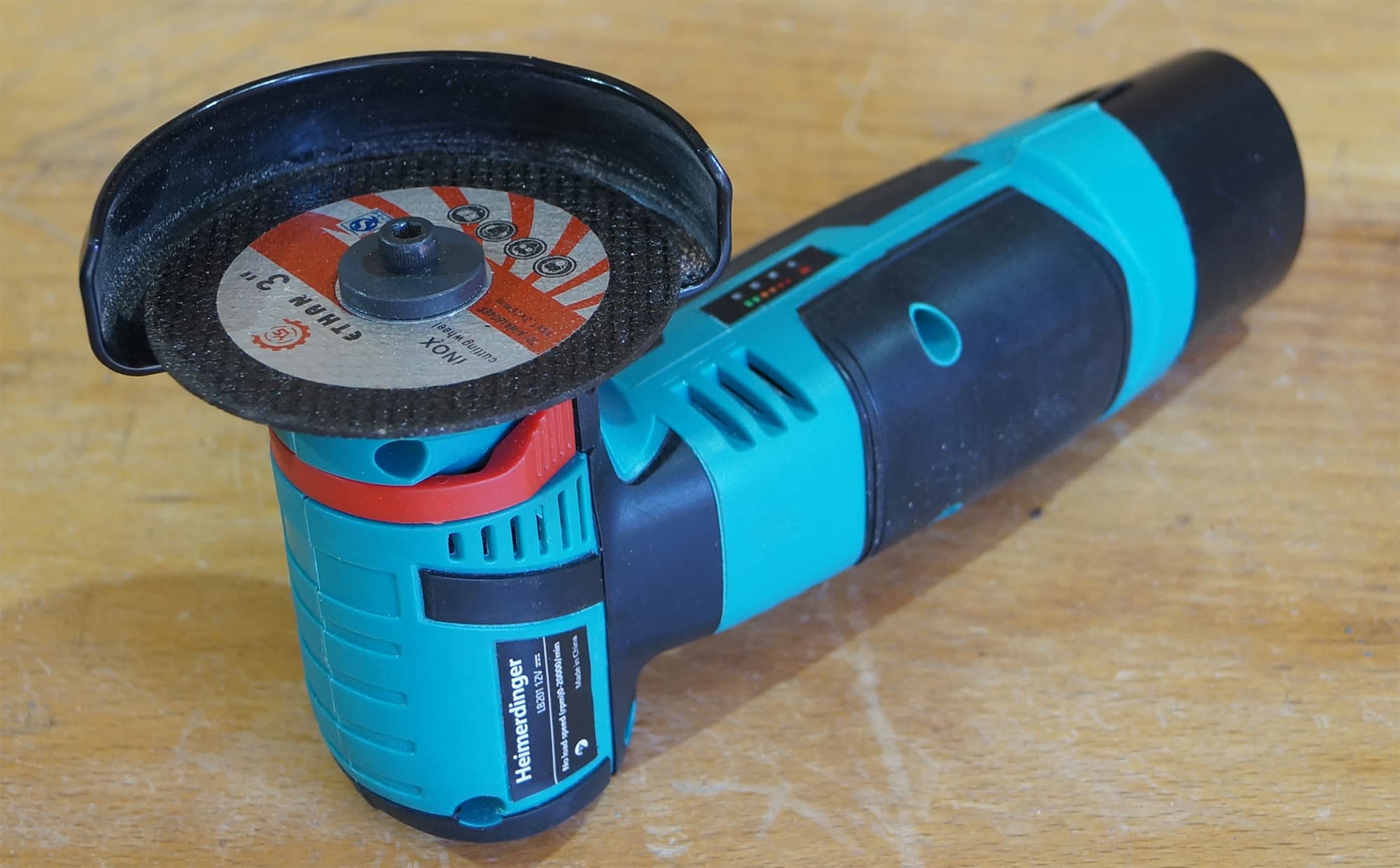 Требование к мощности двигателя при шлифовании значительно увеличивается, поскольку площадь контакта шлифовальной насадки с материалом выше, чем у отрезного круга. Тем не менее, тестирование автономности разумнее всего производить именно в таком режиме. Не станешь же 10-15 минут резать металл? К тому же, наша мини-болгарка совершенно не умеет его резать.