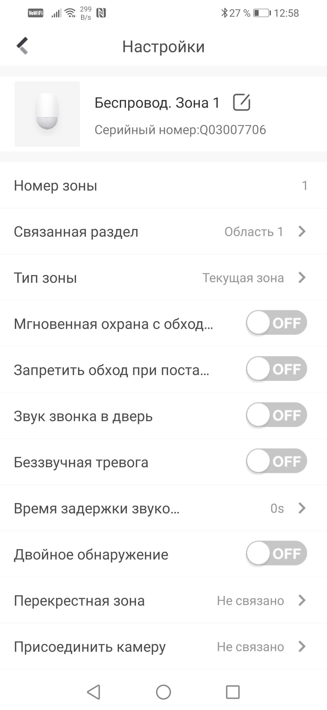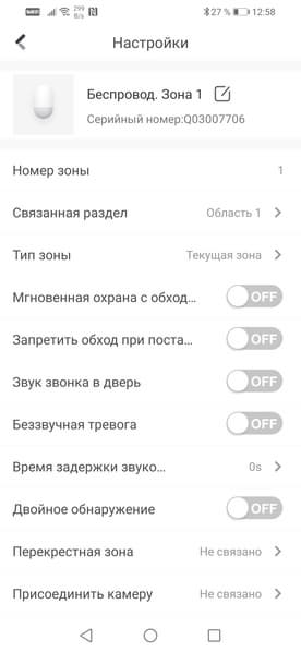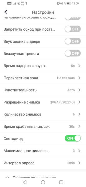Более подробные сведения о текущем состоянии можно получить в настройках датчиков. Кстати, о настройках. Они до удивления насыщенны. Казалось бы, несложные устройства — ИК-датчики движения. Тем не менее настроек в них великое множество. Учтено все возможное, любые сценарии работы, вплоть до беззвучной тревоги и даже активации звука дверного звонка, которым датчик будет реагировать на любое движение теплого объекта весом более 30 кг.