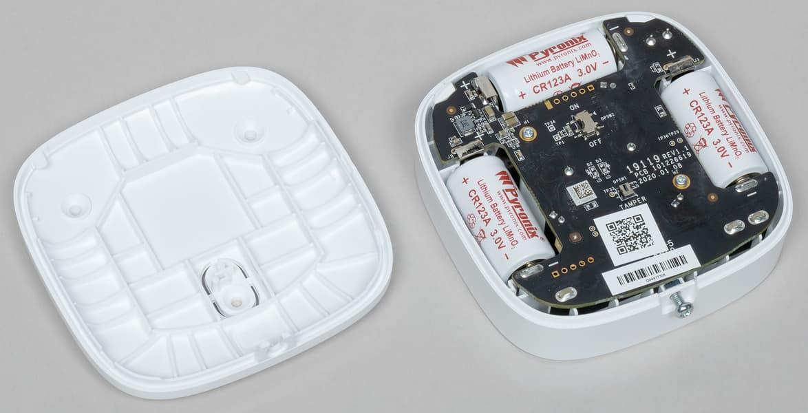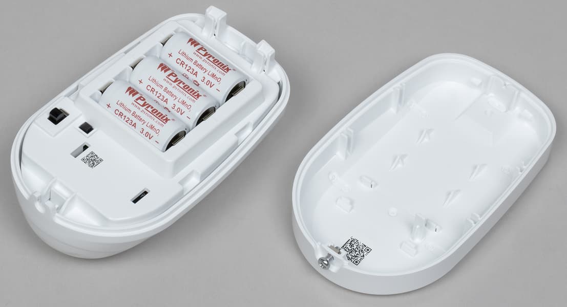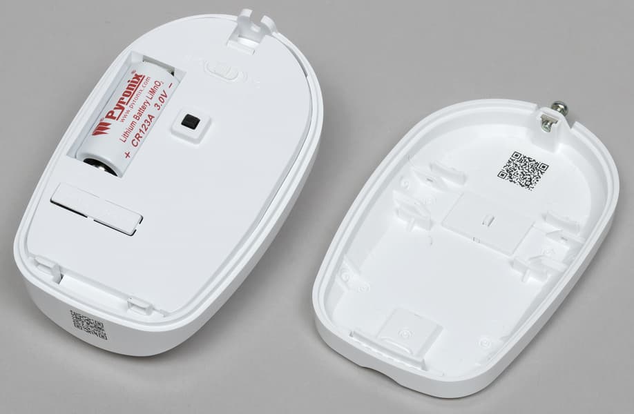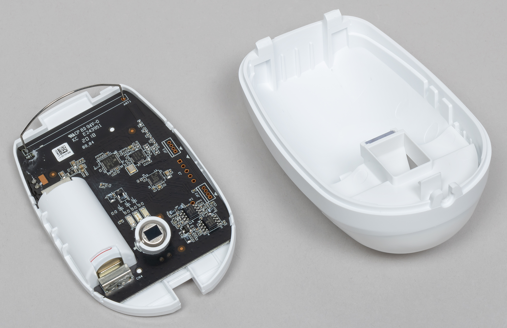 Конструкция устройства совершенно стандартна, поскольку выверена десятилетиями. Такие датчики вы увидите в любом магазине или офисе. Правда, они, скорее всего, проводные, но работают на том же самом принципе. Электроника снимает данные со специального сенсора, который фиксирует источники, и, если замечено малейшее движение, срабатывает триггер тревоги. Вот только в нашем случае сигнал тревоги идет не по проводам, а по радиоканалу. А питание поступает от сменной батареи. Кстати, этой батарейки хватает на пять (!) лет постоянной работы.