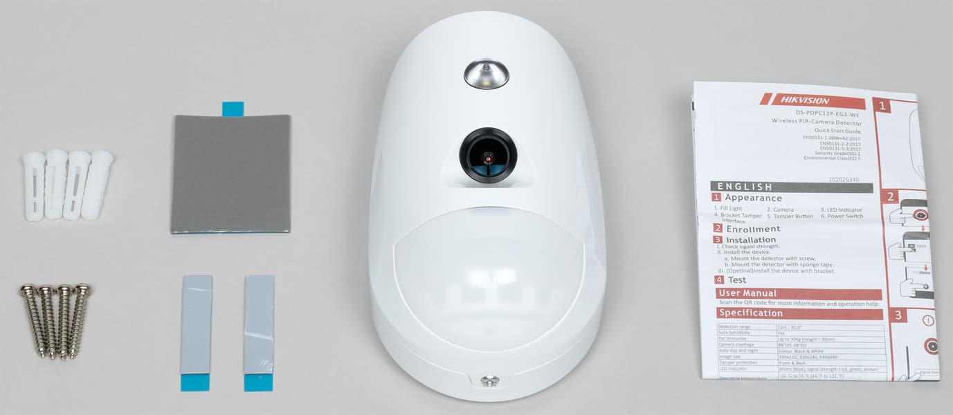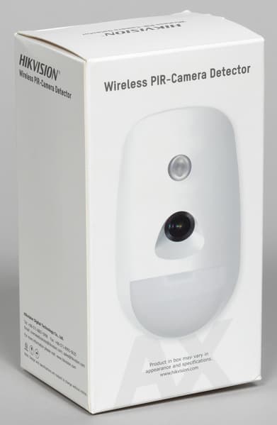 В изученном ранее комплекте мы видели инфракрасный датчик движения. Вот, это тот же самый датчик, но в который умудрились вмонтировать еще и камеру. С соответствующим электронным и программным обвесом. Это устройство поставляется в отдельной упаковке (впрочем, как и все прочие устройства Hikvision).