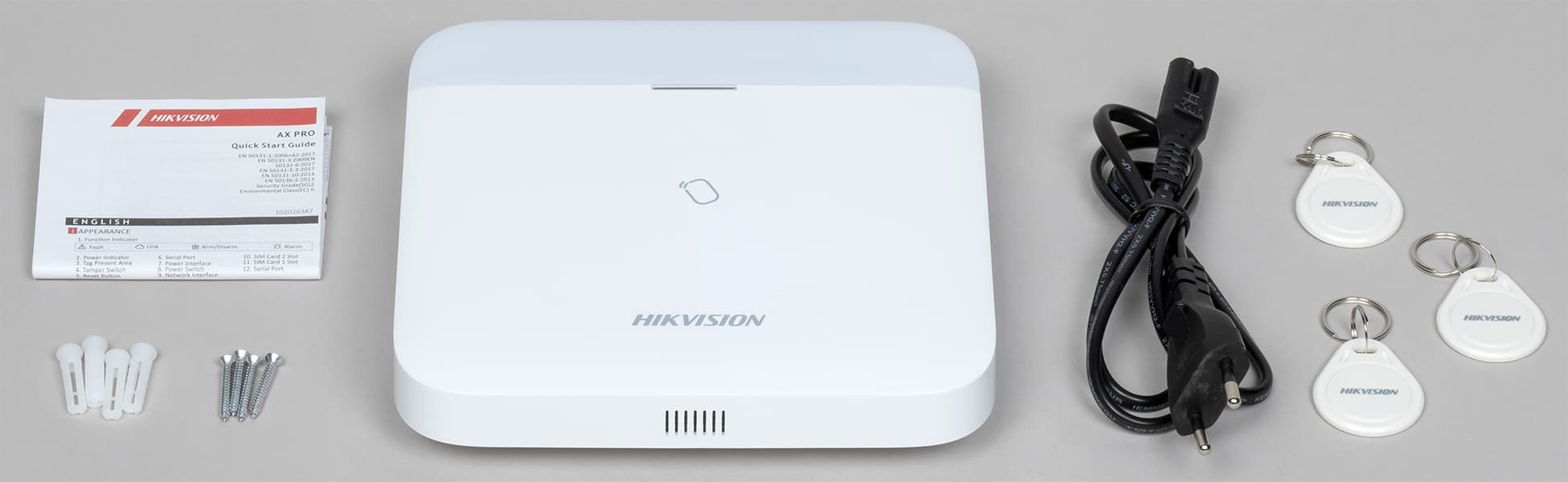 Это достигается благодаря наличию в наборе главного устройства, сердца и мозга системы — AxPro. Станция — или, иначе, хаб — объединяет все поддерживаемые устройства Hikvision в одну систему. Хаб комплектуется крепежными саморезами с дюбелями, кабелем питания и тремя беспроводными RFID-метками.