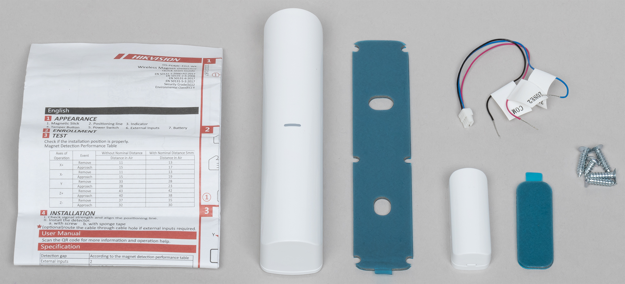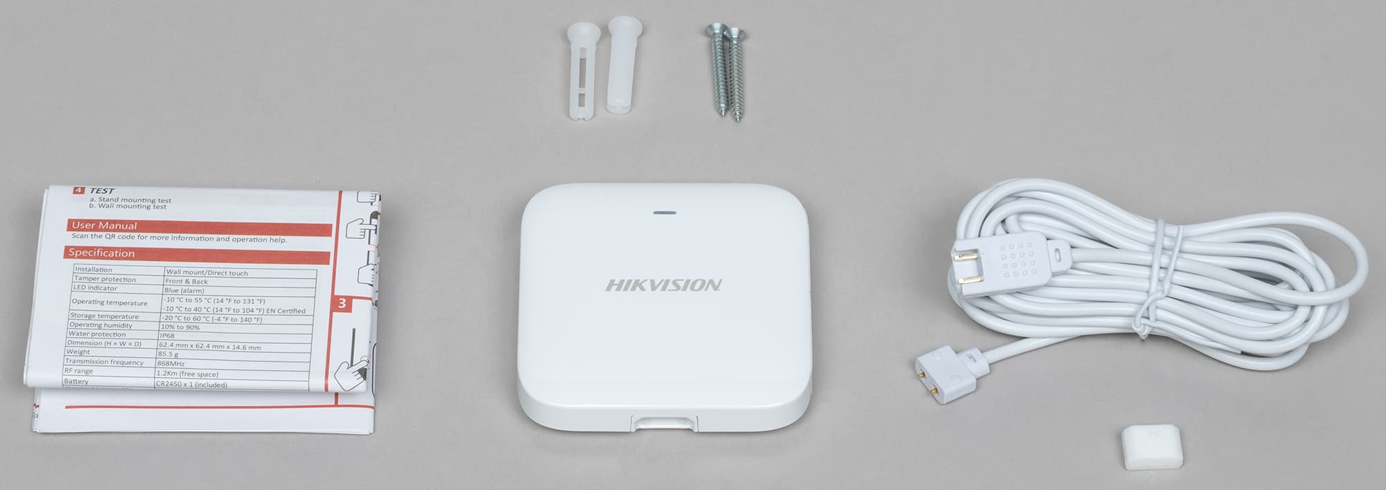 В комплекте имеется парочка дюбелей с саморезами, краткая мультиязычная инструкция и дополнительный выносной датчик, который представляет собой обычную колодку на длинном проводе с контактами на конце.