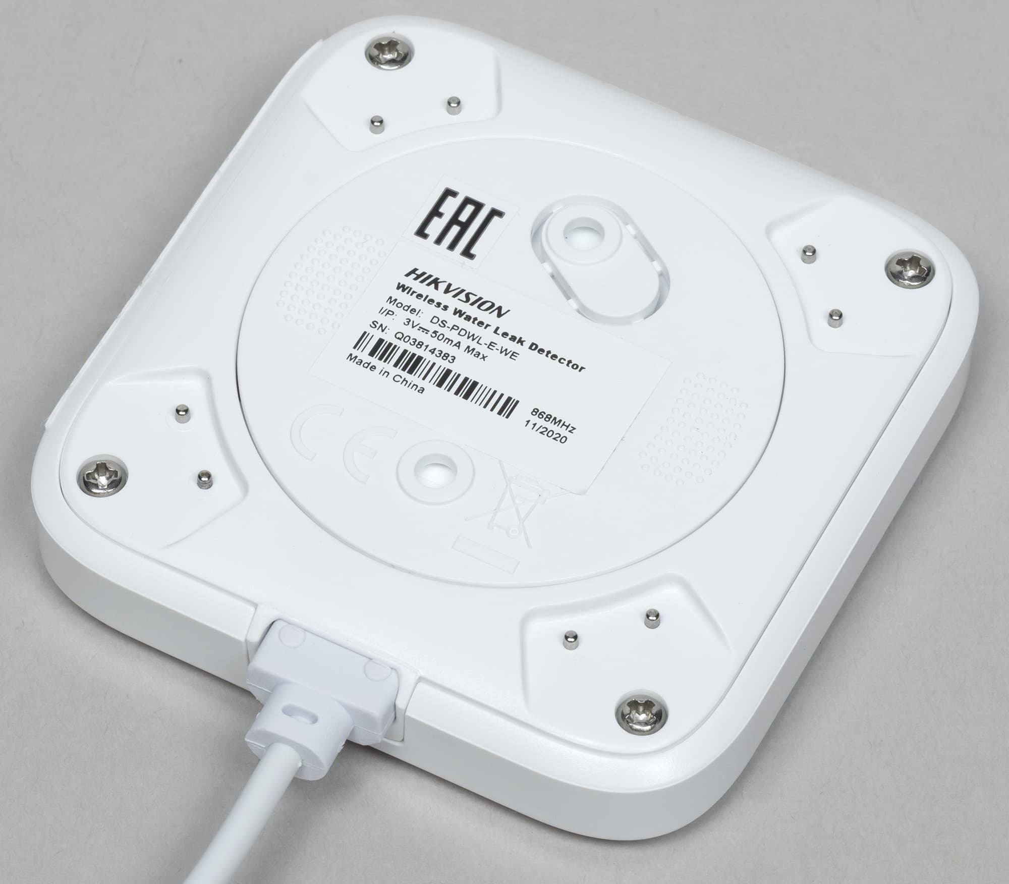 О саморезах. Тяжело представить, зачем прикреплять такой датчик намертво к полу? Который частенько бывает и кафельным, в ванной, например. Нет, это такой намек на другой вариант установки: устройство крепится к стене, а за наличием воды следит тот самый внешний датчик, протянутый вниз и касающийся пола. Тем не менее, если аппарат не прикреплять к стене, мы сильно выиграем. Например, разместить его в месте наиболее вероятной протечки (под раковиной, скажем), а дополнительный датчик вытянуть к другому месту вероятной протечки. Пусть это будет душевая кабина.