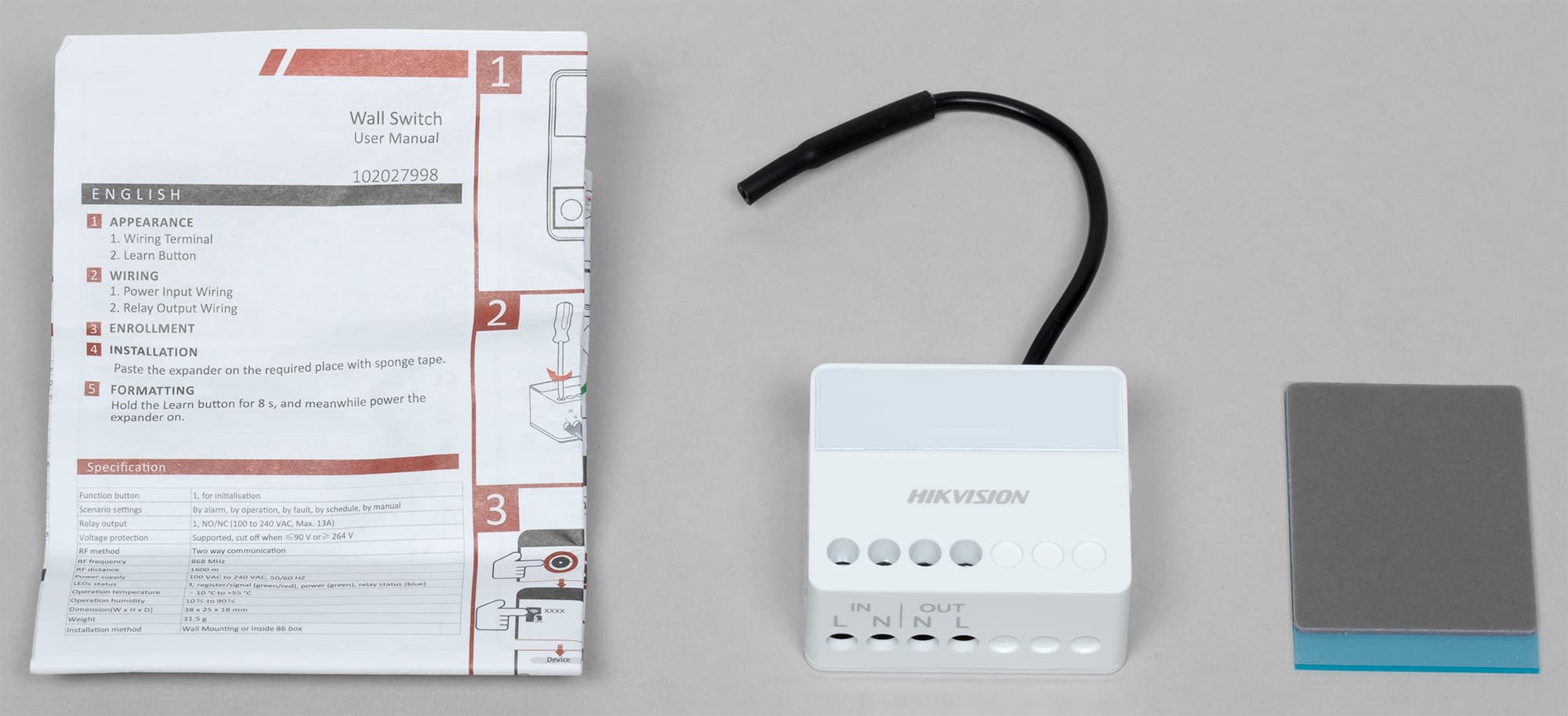 В комплекте с переключателем имеется клейкая полоска для крепления устройства к стене и краткое руководство.